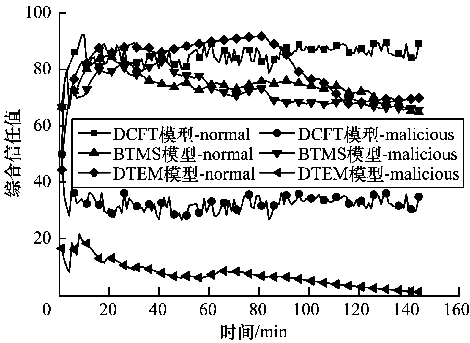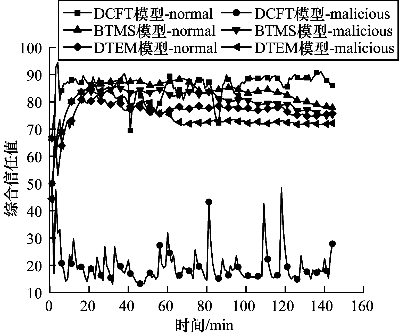 图 8为DCFT、BTMS和DTEM 3种模型中普通(normal)节点与实施选择性转发攻击的恶意(malicious)节点综合信任值随时间的变化曲线。可以看出:3种模型均能明显区分普通节点和恶意节点;BTMS和DTEM中恶意节点综合信任值比DCFT更低,因为其在信任计算中针对恶意行为设置了惩罚因子,而惩罚因子与恶意行为的次数成正比,因此经过60次交互后这2种模型对恶意节点的综合信任值远低于DCFT。