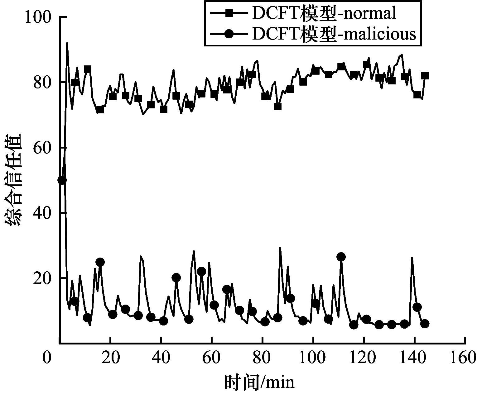 | 图 11 DCFT模型中普通节点与实施综合攻击的恶意节点的综合信任值随时间的变化曲线 Fig. 11 The time-varying curve of the comprehensive trust value between common nodes and malicious nodes implementing comprehensive attack in DCFT model | |