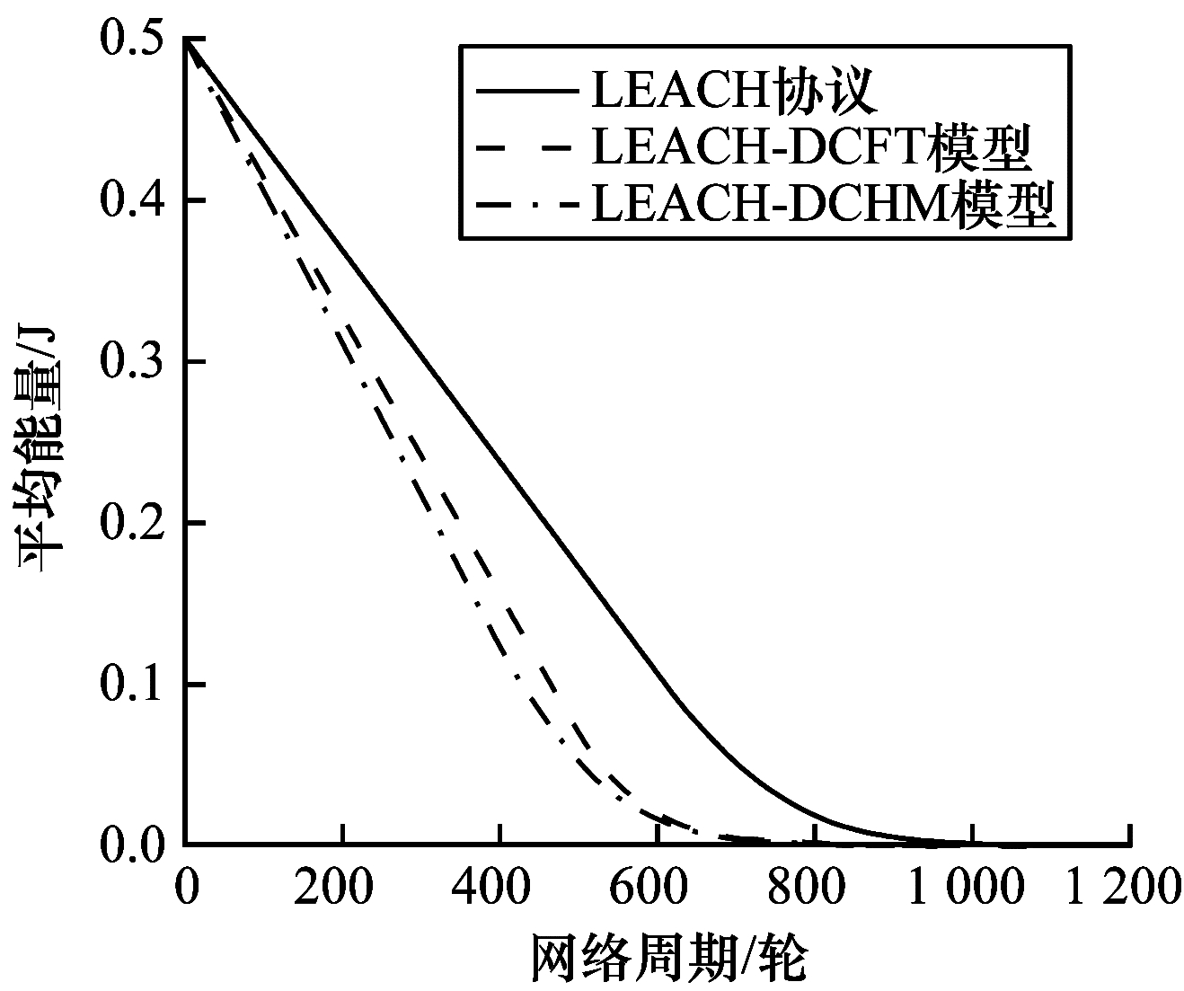 节点剩余平均能量和网络生存周期是两个衡量模型能耗的重要指标。本文结合DCFT模型与LEACH[27]分簇路由协议(LEACH-DCFT)进行分析,并和同样使用双簇头模式且结合LEACH协议的DCHM[21]模型(LEACH-DCHM)进行对比。将100个节点随机分布在100 m×100 m区域内,基站位于坐标(150,50)位置处,节点初始能量为0.5 J。能量消耗与数据异常频率相关,设置有10%的时间会出现伪造融合数据攻击。