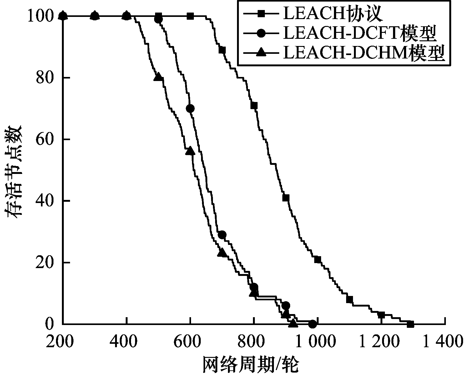 网络生存周期是网络中首个节点死亡时所在的周期,不同网络周期下存活的节点数如图 13所示。可以看出:LEACH-DCHM首个节点的死亡出现在第427轮网络周期,其网络生存周期最短;LEACH-DCFT和LEACH首个节点的死亡分别出现在第493轮和第651轮网络周期,可见双簇头的设计会消耗更多能量;LEACH-DCFT的网络生存周期较LEACH缩短25%,但较LEACH-DCHM延长15%。由于DCHM的双簇头同时向基站发送数据融合结果,而DCFT在数据正常时只有主簇头发送数据融合结果,监督簇头仅发送确认信息,确认信息的数据量约为数据融合结果的1/10,当数据出现异常时,监督簇头才会发送数据融合结果。因此,DCFT在网络安全与能耗之间能实现更好的平衡。