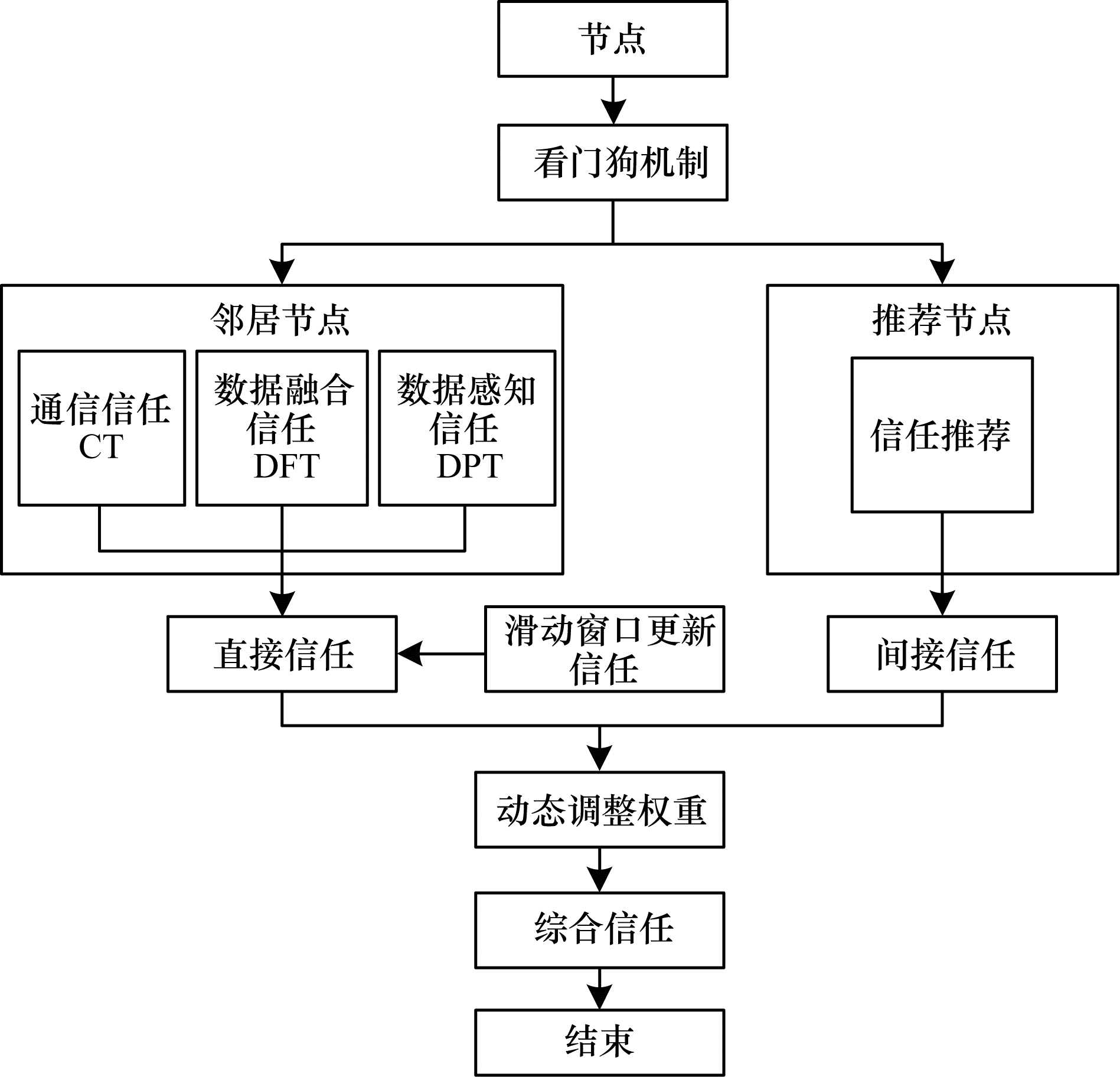 文献[11]提出一种可靠的基于贝叶斯模型的信任管理方案BTMS,其总体信任值由直接信任和间接信任综合得出:直接信任采用修正的贝叶斯方程计算,并引入惩罚因子对节点的不当行为进行惩罚;间接信任根据第三方推荐者的信任级别进行适当加权。仿真结果表明,BTMS在抵御开关攻击和口臭攻击(试图通过诋毁降低对方信誉)方面表现良好,但其未考虑节点数据安全问题。文献[16]提出一种用于无线传感器网络的高效动态信任评估模型DTEM,其通过动态调整直接信任和间接信任的权重与更新机制参数来实现准确、高效和动态的信任评估,其中:直接信任考虑了通信信任、数据信任和能源信任,并具有惩罚因子和调节功能;间接信任根据第三方可信的建议进行评估。在假设簇头层节点无不良行为的情况下,DTEM可对路由攻击和数据信息攻击进行准确的信任评估。
