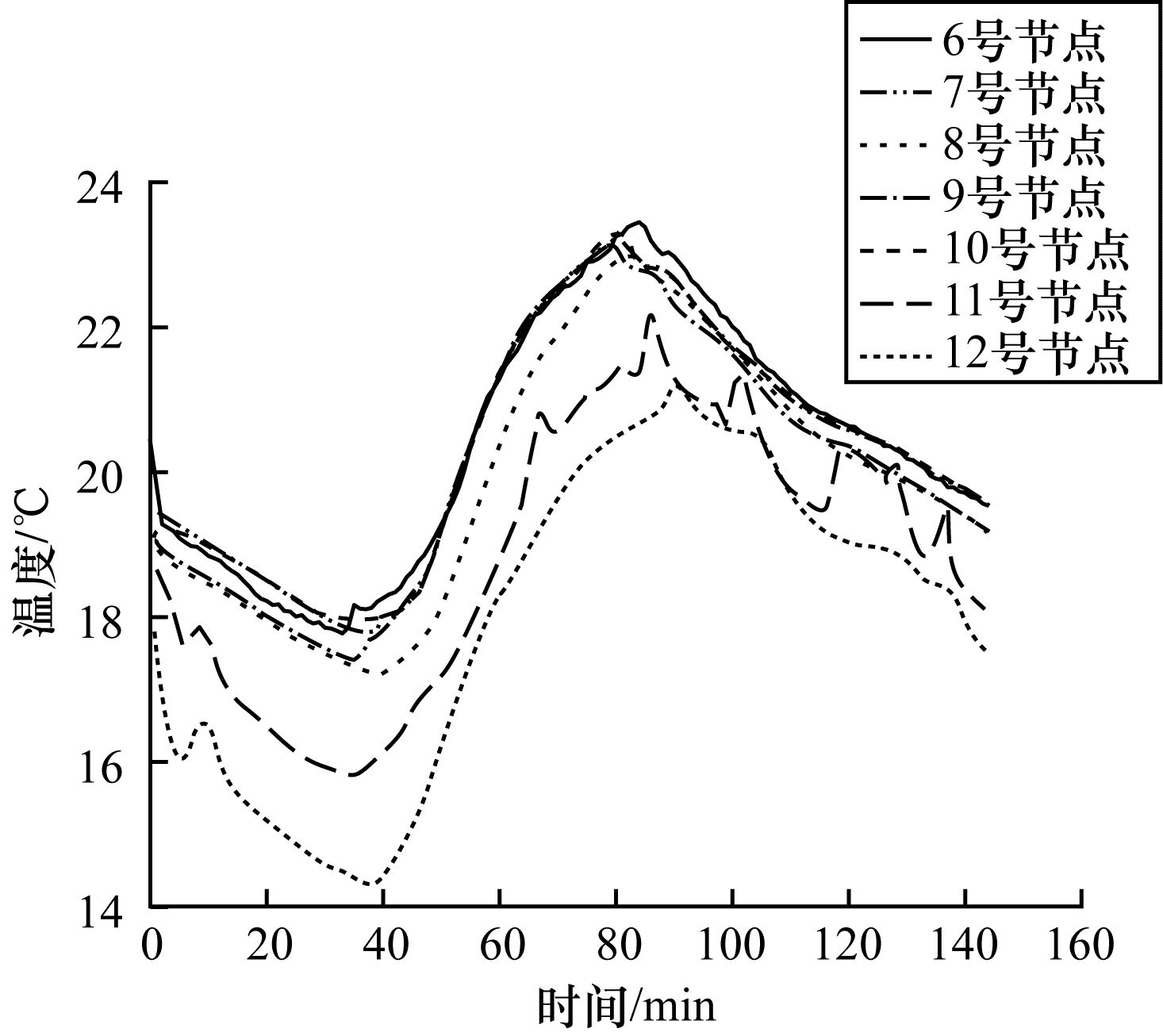 | 图 6 6号~12号节点温度随时间的变化曲线 Fig. 6 Temperature curve of node 6-12 changing with time | |