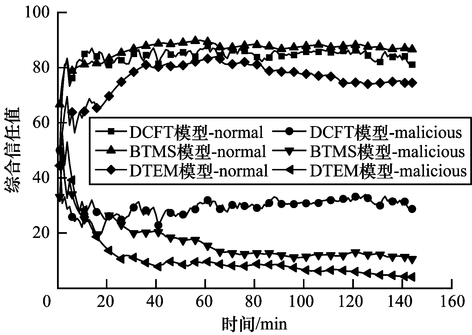 图 11为DCFT中普通节点与实施3种攻击的恶意节点的综合信任值随时间的变化曲线。可以看出:普通节点综合信任值约为80,其与恶意节点综合信任值差异较大;在经过数次不良行为后,恶意节点的检测率达到100%,其综合信任值均小于30;恶意节点的综合信任值波动较大,其原因是攻击为随机注入,而恶意节点并不是每次都进行攻击,但是综合信任会考虑到历史行为,因此恶意节点只要有攻击行为就会降低其综合信任值。