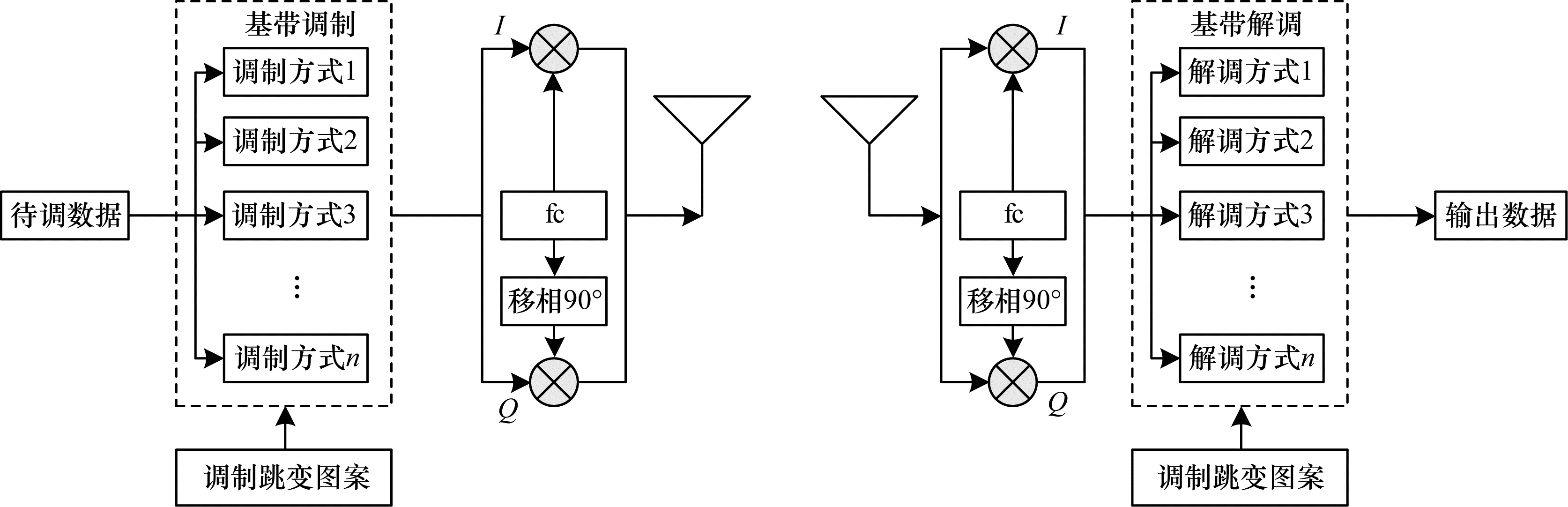 随着软件无线电技术的发展,通信系统多采用基带调制映射和正交变频相结合的通用系统架构,本文所提出的调制跳变系统也采用此种架构,如图 1所示。其中:发射端的基带调制功能根据调制跳变图案进行随机变化,调制后数据流通过正交上变频和天线系统发射;合法接收端收到的射频信号经正交下变频后,利用调制跳变图案进行系统同步,输出有效数据。在此系统中,通信信号的基带调制、解调功能主要由FPGA实现,正交变频功能则可利用射频器件搭建或直接采用AD9361等射频收发器芯片实现。