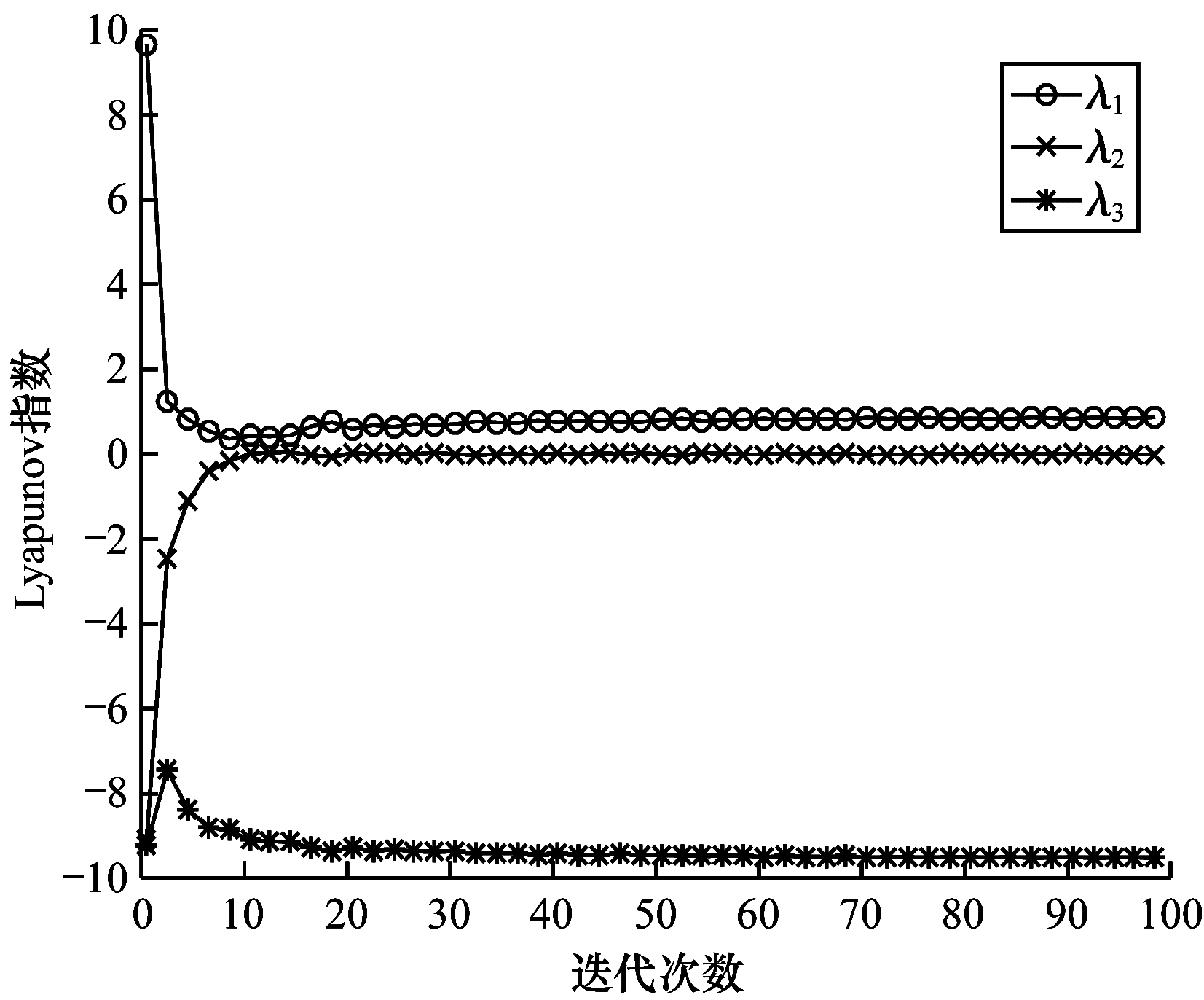 | 图 2 三维混沌系统的Lyapunov指数 Fig. 2 Lyapunov index of three-dimensional chaotic system | |