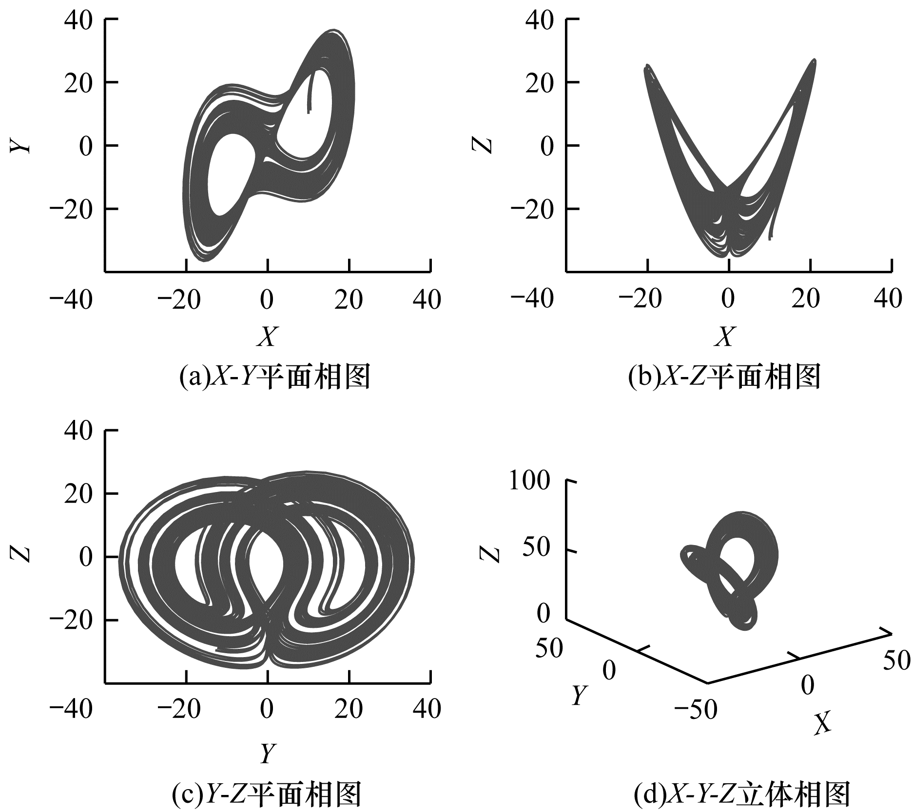 由图 2仿真的Lyapunov指数可知,此时三维混沌系统处于混沌状态,将其产生的三组混沌序列分别记为X、Y、Z,可以得到图 3所示的混沌吸引子平面相图和立体相图。