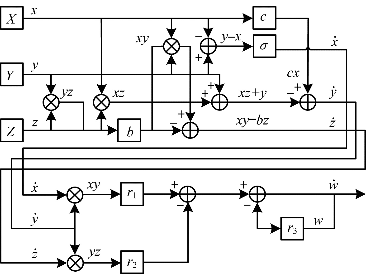 | 图 4 加权反馈三维混沌系统框图 Fig. 4 Block diagram of three-dimensional chaotic system with weighted feedback | |