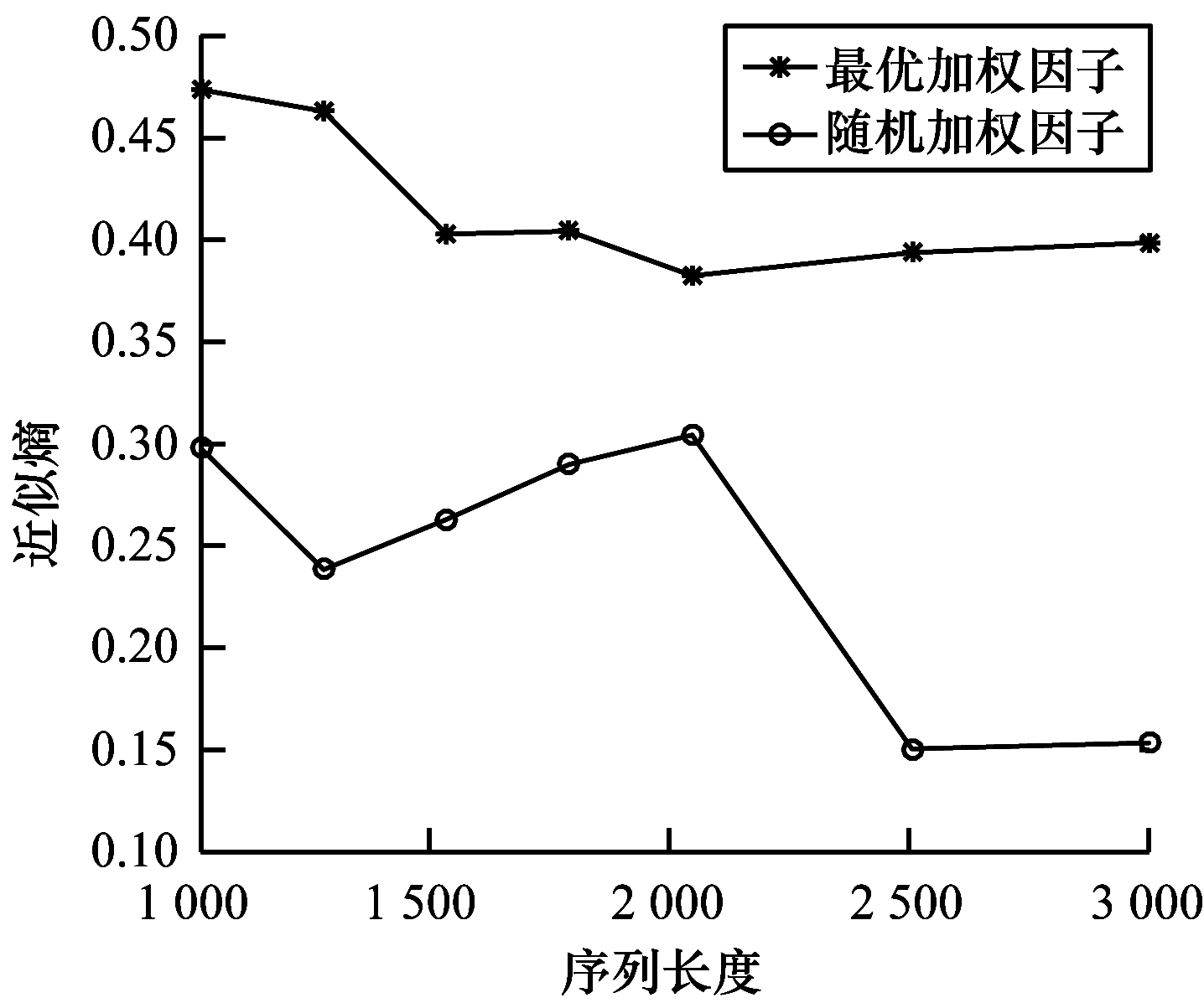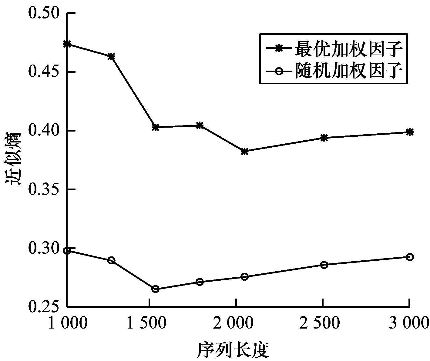 将计算得到的最优加权因子代入式(7),计算不同序列长度下的序列近似熵,并将仿真结果与随机产生的加权因子的输出序列近似熵进行对比。为便于仿真,设定随机产生的加权因子取值范围分别为[0, 1]和[1, 2]。