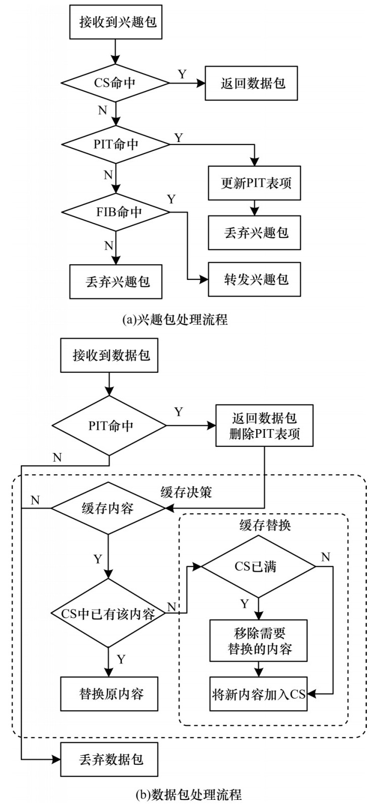 随着移动互联网的快速发展,现有的网络体系在可扩展性、移动性和安全性等方面逐渐出现性能瓶颈。为了适应互联网的需求变化,一种新的网络体系架构——信息中心网络(Information Centric Networks,ICN)[1]应运而生,而命名数据网络(Named Data Networks,NDN)[2]作为ICN架构的一种具体网络实现,受到研究人员的广泛关注。在NDN中,用户通过内容名称去获取内容,而无需关心内容从何而来,同时,在返回内容的过程中会在沿路根据缓存策略进行缓存。