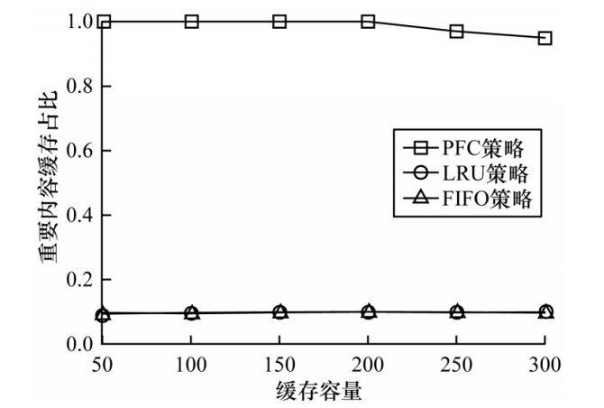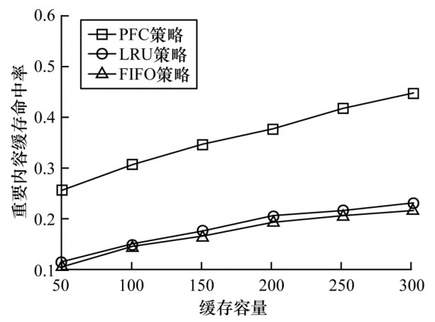 图 4所示为重要内容缓存占比随缓存容量的变化情况,从图 4可以看出,在缓存容量较小时,重要内容在缓存中占比最高,此时缓存的都是较为重要且请求较多的内容,随着缓存容量的增加,重要内容缓存占比开始减小。图 4中开始阶段本文策略的重要内容缓存占比达到1是因为缓存较小,而重要内容的数量大于缓存容量,因此本文策略将重要内容全部缓存从而替换不重要的内容。其他策略的重要内容缓存占比基本保持不变,即它们并不区分重要内容与普通内容。