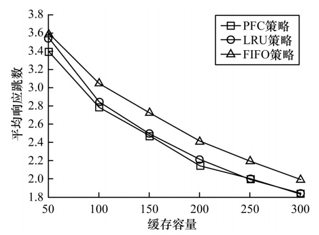 | 图 5 平均响应跳数随缓存容量的变化情况 Fig. 5 The change of average response hops with cache capacity | |
