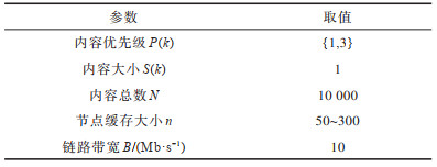 3.1 实验环境使用ndnSIM仿真平台进行实验,网状拓扑共包含50个节点,每个节点既是内容生产者(Producer)也是内容消费者(Consumer),实验参数设置如表 1所示。不同生产者产生的内容有不同的优先级标记,为了方便分析,本文将内容分为重要内容和普通内容2种,其中,10%是重要内容,其余是普通内容,所有的内容流行度服从Zipf-mandelbrot分布,消费者节点对内容的请求服从泊松分布,请求速率为10 req/s。此外,为了模拟移动网络的情景,在仿真进行到5 min时,通过改变节点的通断关系来改变网络拓扑。