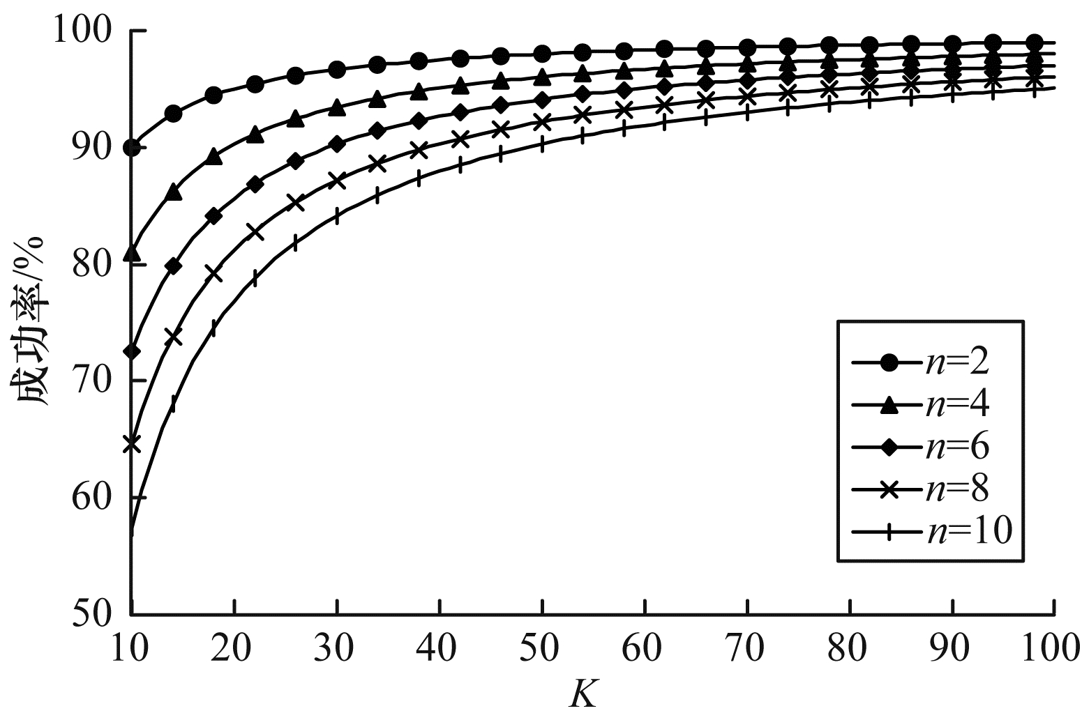 | 图 1 在不同n与K下的竞争成功率计算结果 Fig. 1 Calculation results of competition success rate under different n and K | |