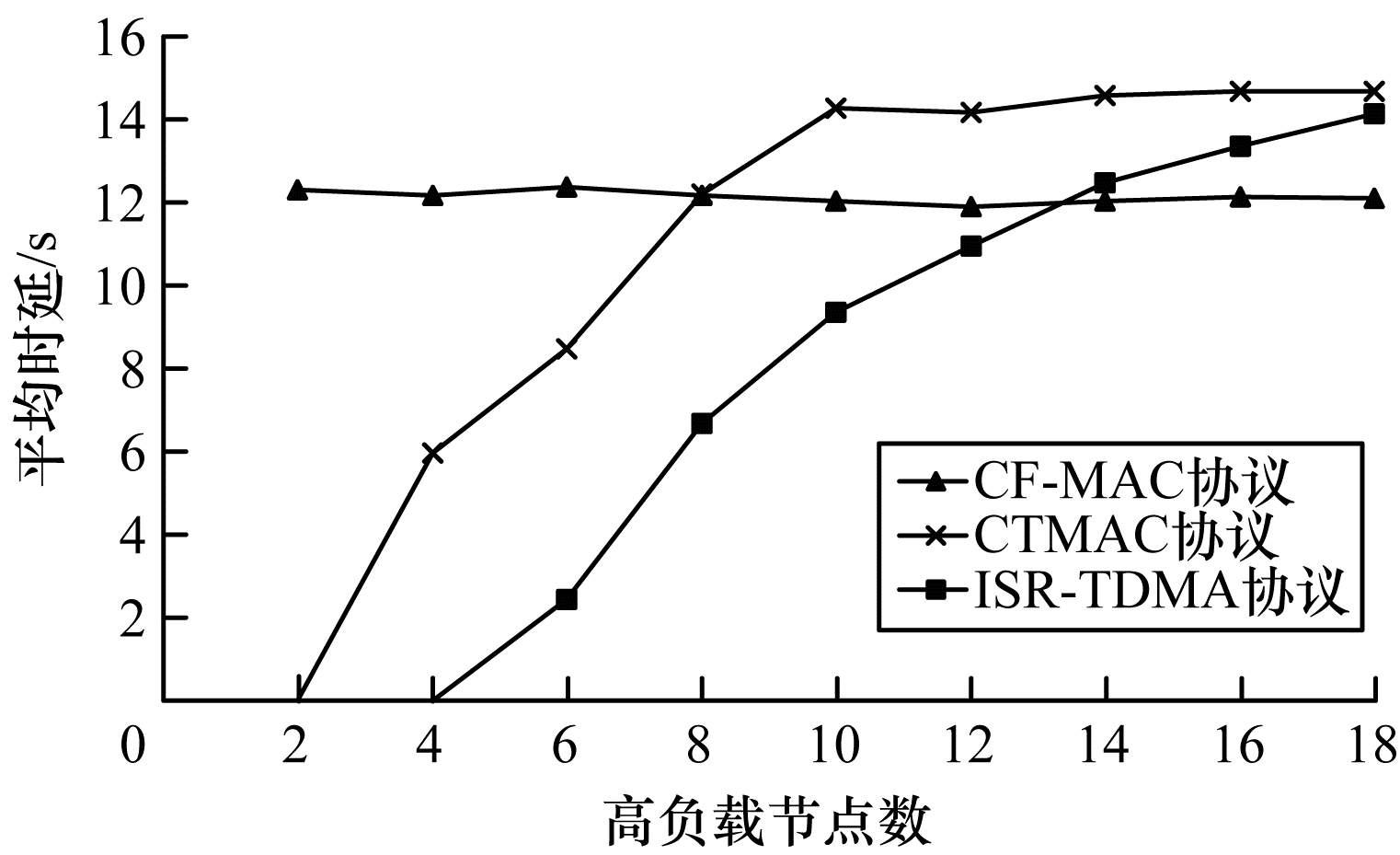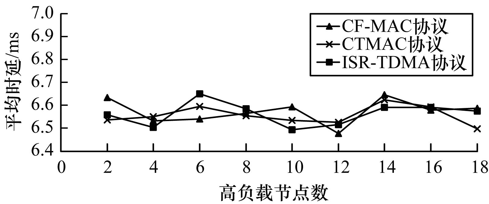 3.2.1 信道利用率与网络吞吐量图 7、图 8为3种协议的信道利用率和网络吞吐量的对比结果。从图 7、图 8可以看出,当高负载节点数较少时,ISR-TDMA、CTMAC可以使用闲置时隙传输数据,信道利用率均高于CF-MAC,并且因为这2个协议能使用更多的时隙传输数据,所以其吞吐量也高于CF-MAC。由于ISR-TDMA比CTMAC少了随机退避的开销,同时不存在竞争冲突,因此其信道利用率及网络吞吐量更高。随着高负载节点的增加,竞争的加剧使CTMAC协议的闲置时隙竞争成功率下降,其信道利用率逐渐接近CF-MAC,此时因为CTMAC存在随机退避开销,每个时隙可传输的数据量少于CF-MAC,所以其吞吐量反而要低于CF-MAC。当网络中多数节点均为高负载节点时,闲置时隙越来越少,3种协议的信道利用率逐渐接近。此时CF-MAC的额外开销最少,但其网络吞吐量最高。