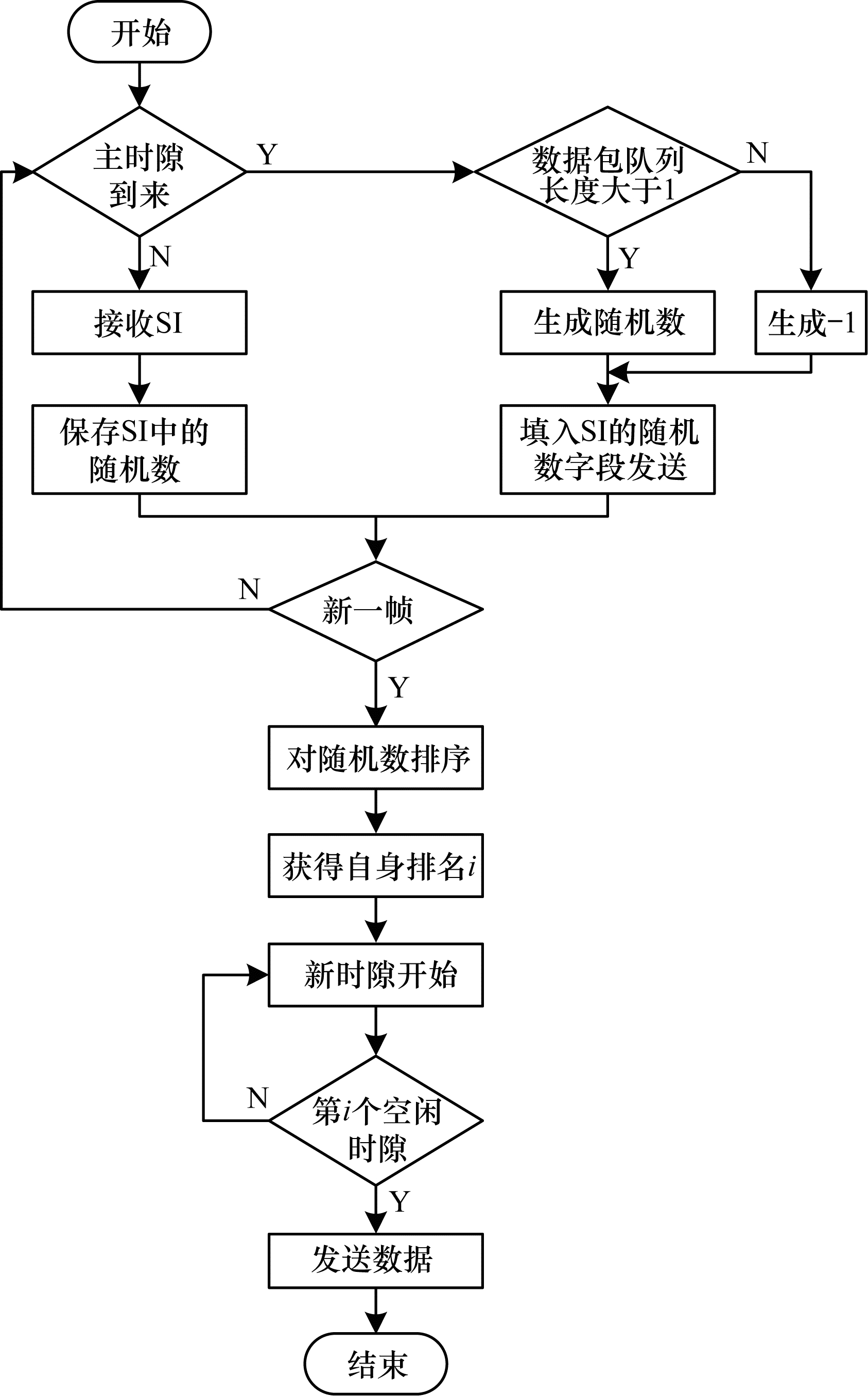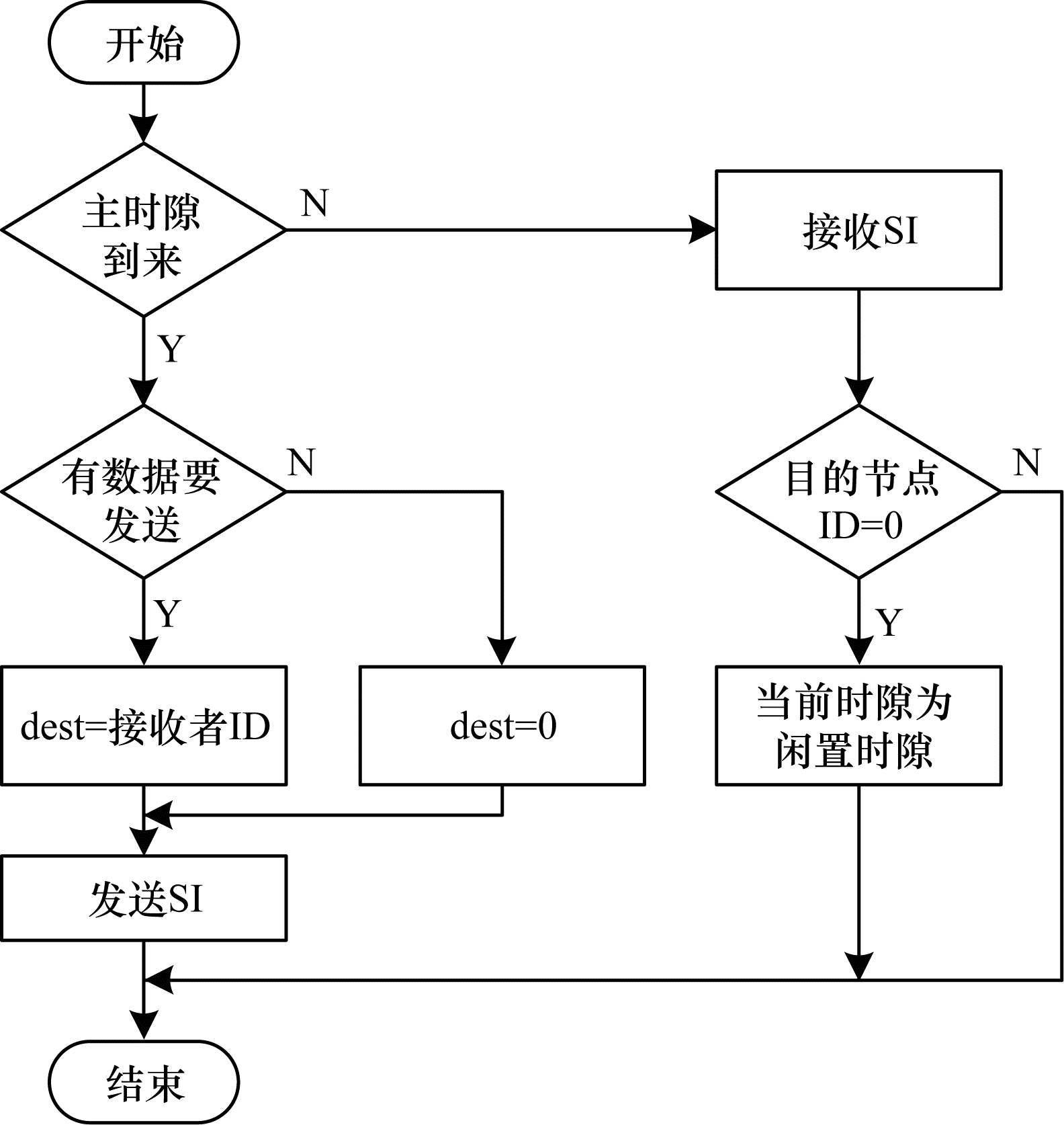 图 4给出了闲置时隙感知流程。由此可知,在每个时隙开始后,无论主节点有无数据包需要传输,都要在时隙开始后传输SI。若主节点有数据包需要传输,则在目的地址字段填上接收节点的ID,否则填0。其他节点在收到SI后,根据目的节点ID数值即可判断当前时隙是否会被主节点用于传输数据。若有数据要传输,则主节点在发送SI后紧接着发送数据包;若没有数据包要传输,当前时隙就是一个闲置时隙,其他有数据包传输的节点将根据预约结果使用该时隙进行数据传输。