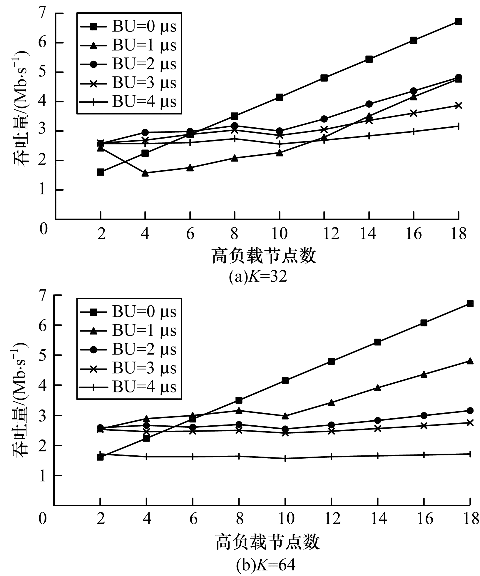 图 6给出了高负载节点数分别为32和64时BU对网络吞吐量的影响,BU为0表示不采用载波监听与随机退避机制,仿真场景中信号的最大传播时间约为48 μs。可以看出,BU取较小值时,该机制对固定分配TDMA协议的吞吐量有一定提升。当BU较大时,竞争开销在整个时隙中的占比较大,单个时隙可传输的数据量变少,使得信道利用率的提升也无法引起吞吐量的增加,反而会降低吞吐量。当BU为1 μs、K取64时,吞吐量最高。后续仿真将使用该参数进行协议之间的对比分析。