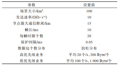 实验的主要仿真参数如表 2所示。高、低优先级业务产生的数据包个数均服从泊松分布。为保证对比的合理性,实验对CF-MAC、CTMAC与本文协议进行了适当修改,3种协议的帧长、时隙数、保护间隔均按照表 2给出的参数进行设定。此外,还为3种协议设计了优先级机制,当同时有高、低两种优先级的数据包需要发送时,优先发送高优先级数据包。