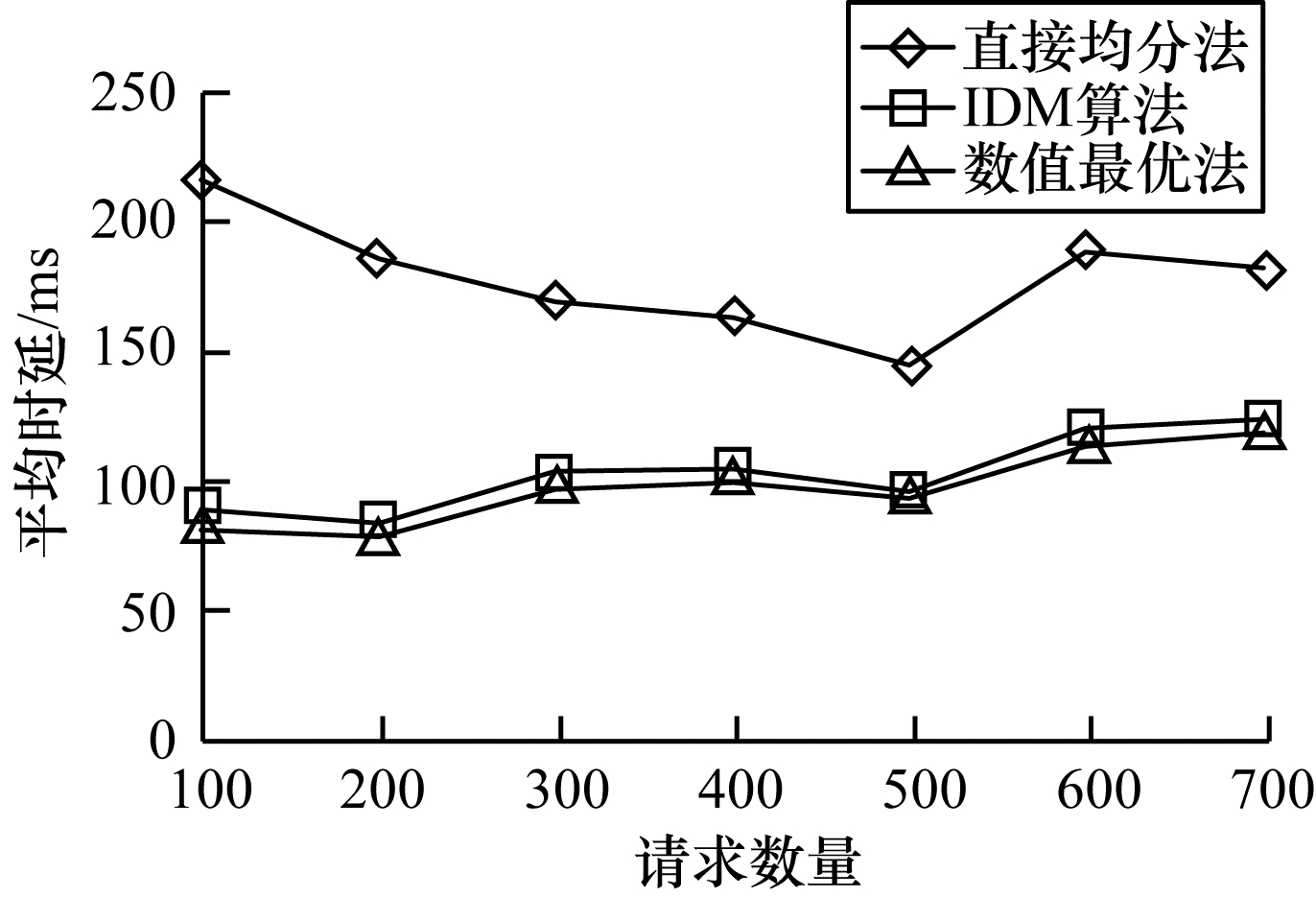 首先研究请求数量对于平均时延的影响,如图 3所示。当请求数量较少时,请求可能集中地被少数基站处理,因此,直接均分会使很多不需要执行任务的基站分配到较多的资源,导致需要计算的基站资源减少,从而增加时延。之后随着请求数量提升,请求分布更趋均匀,基站的任务分配也更均衡,所以,时延会有下降趋势。IDM算法的平均时延始终与数值最优的平均时延非常相近,保持在常数级的差别,由此可以看出IDM算法对最优的逼近效果较好,对于请求数量的变化表现也很稳定。