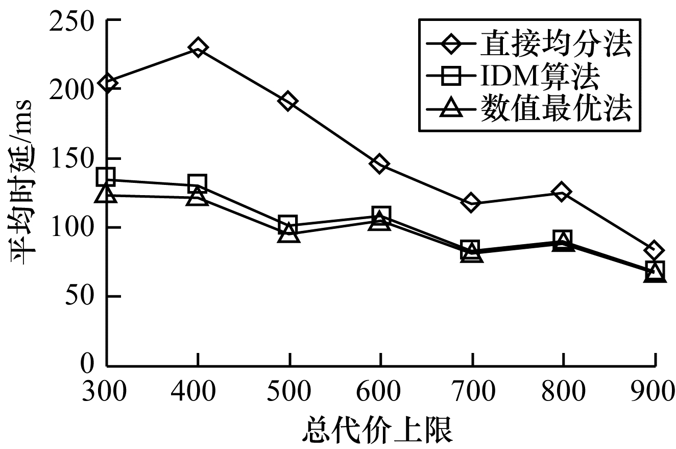 | 图 4 中小规模场景下总代价上限对平均时延的影响 Fig. 4 Influence of limit of total cost on average delay under small and medium scale scenarios | |