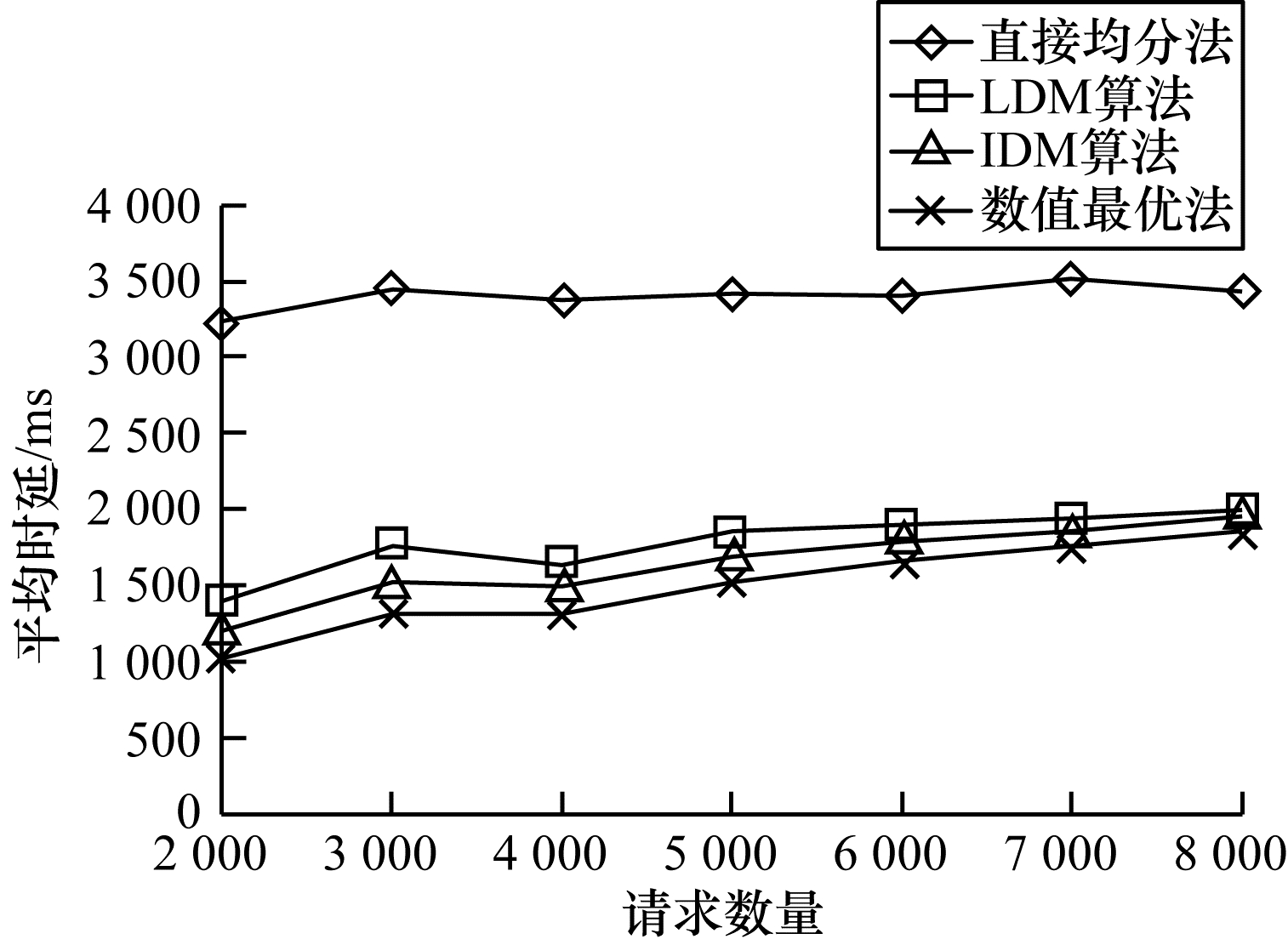 考虑到请求数量是大规模场景中最重要的影响因素,因此本文研究在请求数量达到2 000以上的情况下,随着请求数量增加各部署算法平均时延的变化情况,如图 5所示。可以看出:直接均分法的平均时延上升极为缓慢,基本不变;LDM算法、IDM算法与数值最优的平均时延都在缓慢上升,增长也越来越缓慢;当请求数量越来越多时,LDM算法与数值最优的差距越来越小,不断逼近;在整个过程中,LDM算法的平均时延都与数值最优相差不多。由此可见,LDM算法更适用于存在大量请求的环境。