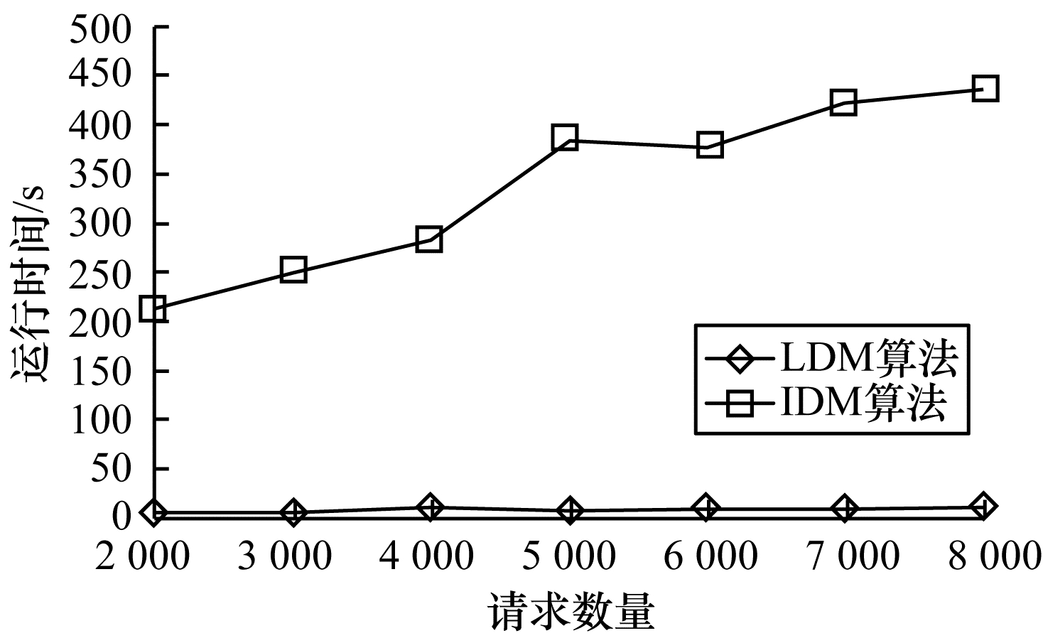 | 图 6 大规模场景下请求数量对运行时间的影响 Fig. 6 Influence of number of requests on running time under large scale scenarios | |