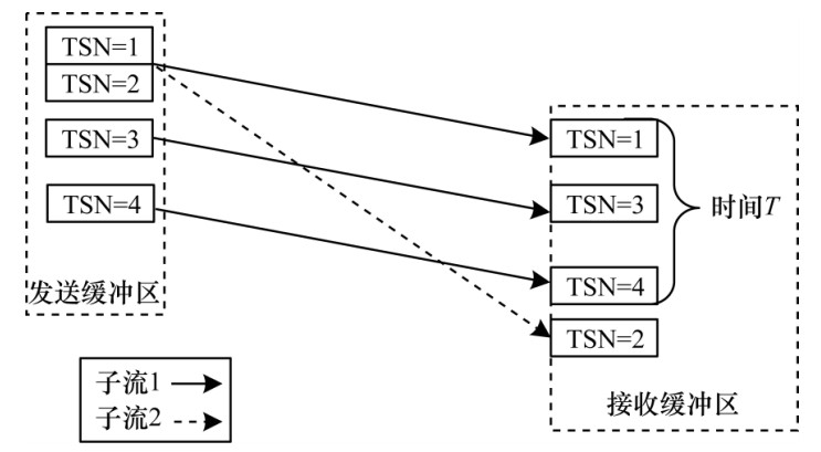 2 自适应多路传输数据调度机制 2.1 问题分析在无线异构网络中采用MPTCP传输数据包时,不同类型的通信系统相融合需使用多条路径,且传输过程的链路性能存在较大差异。传输性能差异将造成传输序列号(Transmission Sequence Number,TSN)较大的数据包先到达缓冲区,从而引起数据包乱序问题[14],而接收端由于无法及时将缓冲区中的数据向上层应用传输而造成数据流传输时间的延长。