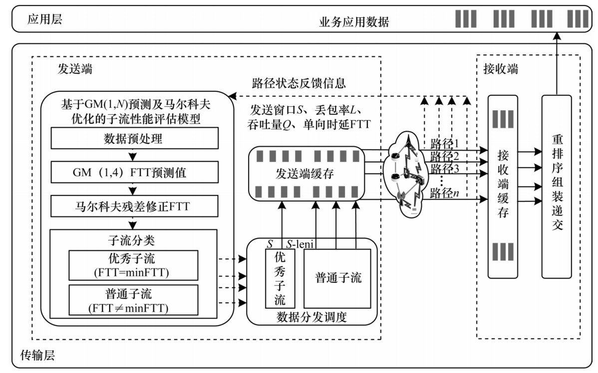 2.2 GMM-S自适应多路传输数据调度方案基于GM(1,N)的FTT预测及马尔科夫优化多路数据传输调度方案主要由基于GM(1,N)预测与马尔科夫优化的子流性能评估模型以及数据分发调度2个部分组成,具体构成如图 2所示。其中,实线箭头表示数据流,虚线箭头表示信息流。在STPEM中首先获取MPTCP子流中的发送窗口、丢包率、吞吐量和前向传输时延数据4组可直接获取的已知影响因素,即选取N=4,建立GM(1,4)模型预测该子流下一时刻的FTT,之后在GM(1,4)预测基础上实施马尔科夫残差修正,即根据FTT预测值与实际值的相对误差建立马尔科夫残差修正模型对GM(1,4)预测值进行修正,以完成对子流FTT的预测,量化子流传输质量,且修正后的FTT预测值越小表示该子流的传输性能越好。随后,在DDS部分根据FTT预测值对子流进行分类,选取最短预测FTT的子流为优秀子流。在优秀子流上根据拥塞窗口大小发送足够多数量的数据包,而在普通子流上,则根据其与优秀子流的预测FTT时延差,实施传输数据包发送数量的动态调整。