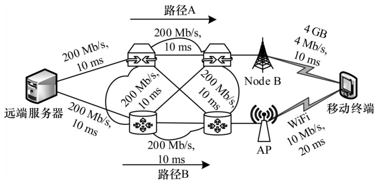 1 相关工作 1.1 MPTCP数据调度MPTCP由IETF提出[5],其作为TCP的扩展,目的是通过聚合多路径带宽来提高资源利用率及网络吞吐量。数据调度算法是MPTCP的重要组成部分,MPTCP数据调度对应用层数据流实施分段并在每个子流上进行数据传输,同时提供耦合拥塞控制以保障与正常TCP连接的公平性[6]。传统的MPTCP数据调度算法通常采用静态和动态两类方式。其中,静态方式主要针对同构网络环境,该类算法不考虑路径的状态特性,其是通过借助拥塞窗口对数据包进行分配。静态方式的代表性算法有随机调度和轮询调度,轮询调度(Round-Robin,RR)是一种广泛应用于数据包分配[7]的算法,该算法对将要发送的数据段,从当前所有可用路径中按子路径从1~N的顺序选取下一个有空余发送窗口的路径作为本次调度的路径选择。静态方式对于同构网络的性能表现较优,但在异构网络环境中其传输性能没有单路径传输更有优势。动态方式针对静态调度策略的不足,将路径特性纳入考虑,且每次对路径选择时根据各路径的传输特性优先选择传输质量较好的路径进行数据传输[8]。其中,基于最小往返时延(Round-Trip Time,RTT)的调度算法LowRTT[9]优先选择传输延迟最小的路径作为最佳路径,且当最佳路径的发送窗口为0时,再选择传输时延次小的路径作为最佳路径。与RR算法相比,LowRTT算法能够更好地缓解数据包乱序问题,但由于每次仅选用一条子流进行数据传输,其未能充分利用多路径并行传输的优势[10]。