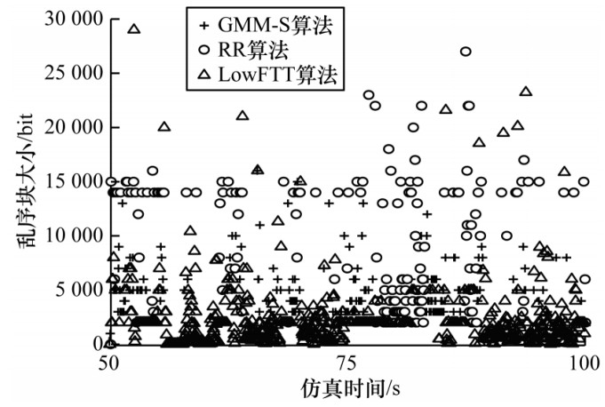图 5给出了应用GMM-S、RR、LowRTT三种数据调度算法在无线异构网络中传输过程中出现的数据块乱序情况。从图 5可以看出:在50 s~100 s的时间间隔内,RR算法共发生199次乱序,最大乱序块大小为27 000 bit;LowRTT算法共发生749次乱序,最大乱序块大小为29 000 bit;而GMM-S算法共发生176次乱序,最大乱序块大小为16 000 bit。总体而言,GMM-S相比RR和LowRTT所产生的乱序块更少且乱序数据块也更小。这主要是由于GMM-S实现了路径质量的实时评估,并在数据分发时根据子流预测FTT自适应地分发数据包,尽可能地保障数据包按序到达所导致的,GMM-S不仅明显减少了数据包乱序的发生次数,同时也降低了乱序程度。