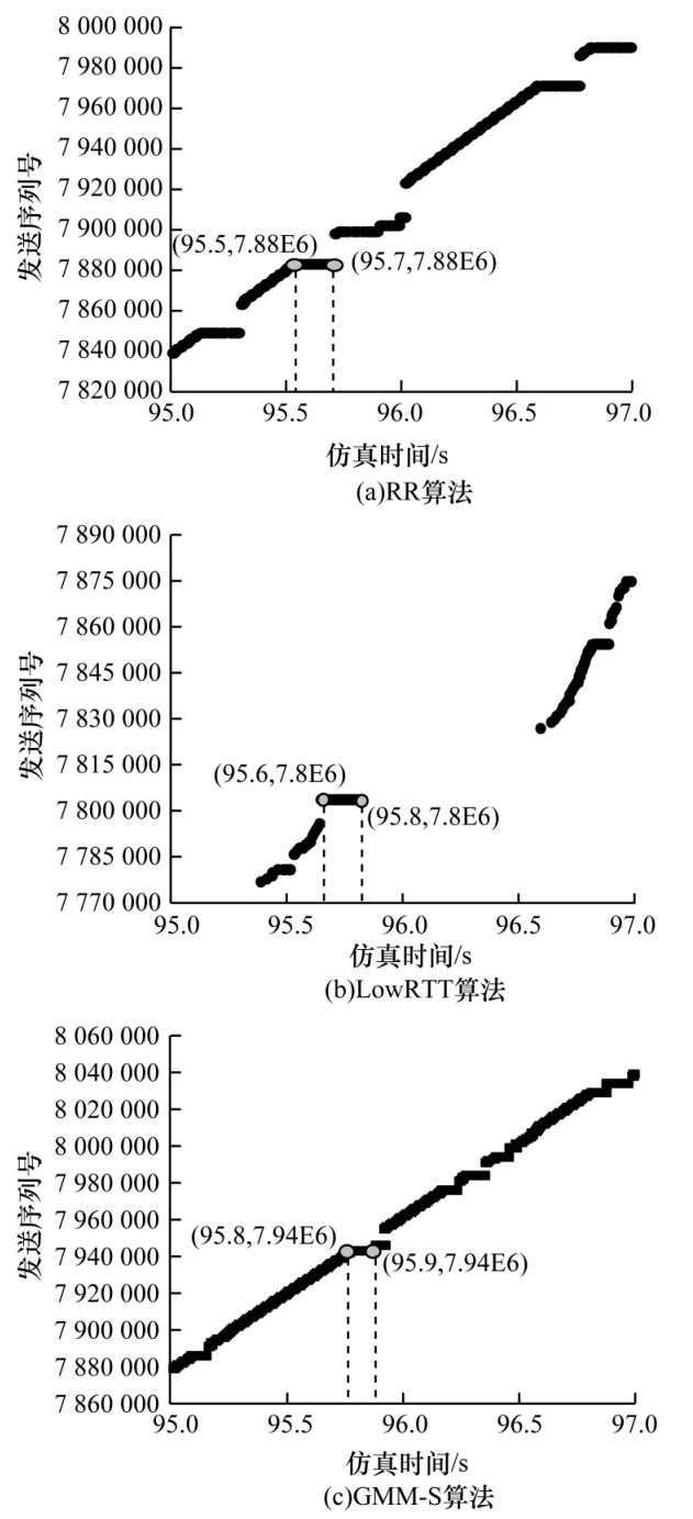在实验中,本文通过设置随机丢包率来模拟无线异构网络的不确定性,在传输过程中丢包的发生会引发重传。图 6给出了GMM-S、RR、LowRTT三种算法数据发送到达结果对比。在理想状态下,按序传输数据包且接收端按序接收,TSN随时间变化的图像应为单调平稳递增的图像,但重传的发生会因为反复传输而使图像出现水平线段。从图 6可以看出:RR在95.5 s时发生了一次重传,持续时间为0.2 s;LowRTT在95.6 s时发生了一次重传,持续时间为0.2 s;GMM-S则是在95.8 s时发生了一次重传,持续时间为0.1 s。GMM-S的重传持续时间最少。此外,在数据传输过程中,若发生乱序或发送数据包过大的情况会导致缓冲区阻塞,致使发送端数据包停发,在图像中表现为中断现象。在图 6中,95 s~97 s的时间段内,RR产生了4次明显中断,LowRTT产生了5次明显中断,而GMM-S仅产生2次明显中断,且中断时间远小于RR和LowRTT,这表明GMM-S工作时接收端数据接收更为平稳。