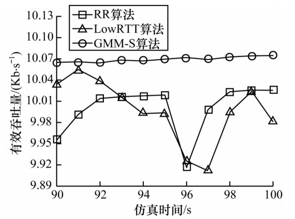 在图 7中,RR的有效吞吐量波动区间约为0.1,LowRTT有效吞吐量波动区间约为0.15,而GMM-S波动区间仅为0.01,且持续稳定在10.06 Kb/s~10.07 Kb/s之间。在95 s~96 s时间段内RR、LowRTT及GMM-S均发生了重传,有效吞吐量发生了下降,但由于GMM-S的自适应数据包分发机制会在产生丢包的子流上动态分配较少的数据包,因此GMM-S的有效吞吐量在重传发生时未受到严重影响。