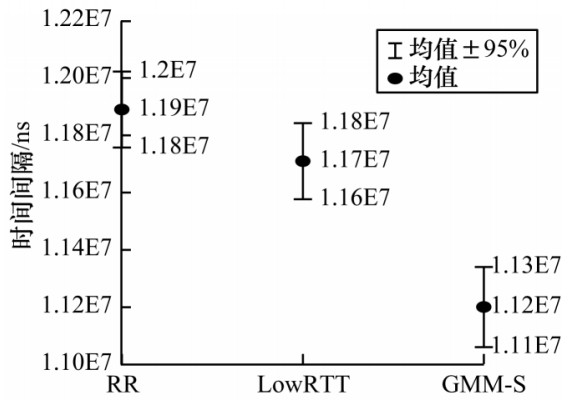 图 9给出了应用层数据接收时间间隔的分布数据,应用层接收时间间隔分布以平均值±95%的置信区间来反映。从图 9可以看出:RR的应用层数据接收时间间隔主要分布在1.18E7 ns~1.2E7 ns之间;LowRTT的应用层数据接收时间间隔主要分布在1.16E7 ns~1.18E7 ns之间;而GMM-S的应用层数据接收时间间隔则主要分布在1.11E7 ns~1.13E7 ns之间,范围明显小于RR和LowRTT。这表明GMM-S可提供更稳定的应用层数据传送,为网络传输服务质量及良好的用户体验提供保障。
