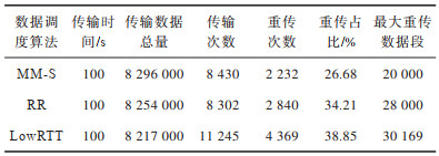 表 3给出了GMM-S、RR及LowRTT三种调度算法的传输时间、传输数据总量、传输次数、重传次数、重传占比及最大重传数据段等数据。