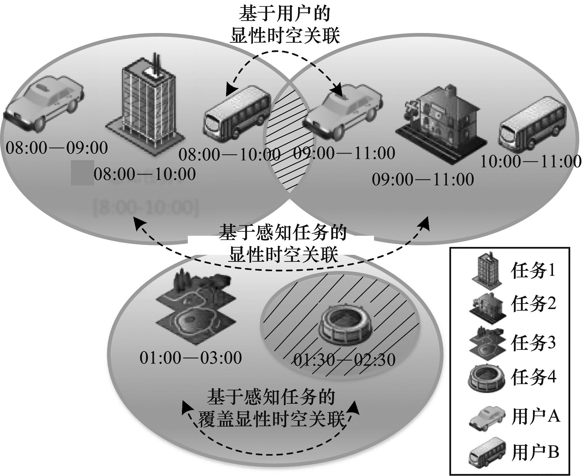 感知任务1和感知任务2是基于感知任务的显性时空关联,因为感知任务1和感知任务2有重叠时间,重叠时间间隔为09:00—10:00。另外,空间重叠为阴影部分,在任务发布后用户只需满足该部分的时空要求。感知任务3和感知任务4是基于感知任务的覆盖显性时空关联,因为感知任务3覆盖感知任务4,所以发布任务后只需满足感知任务3的时空要求。