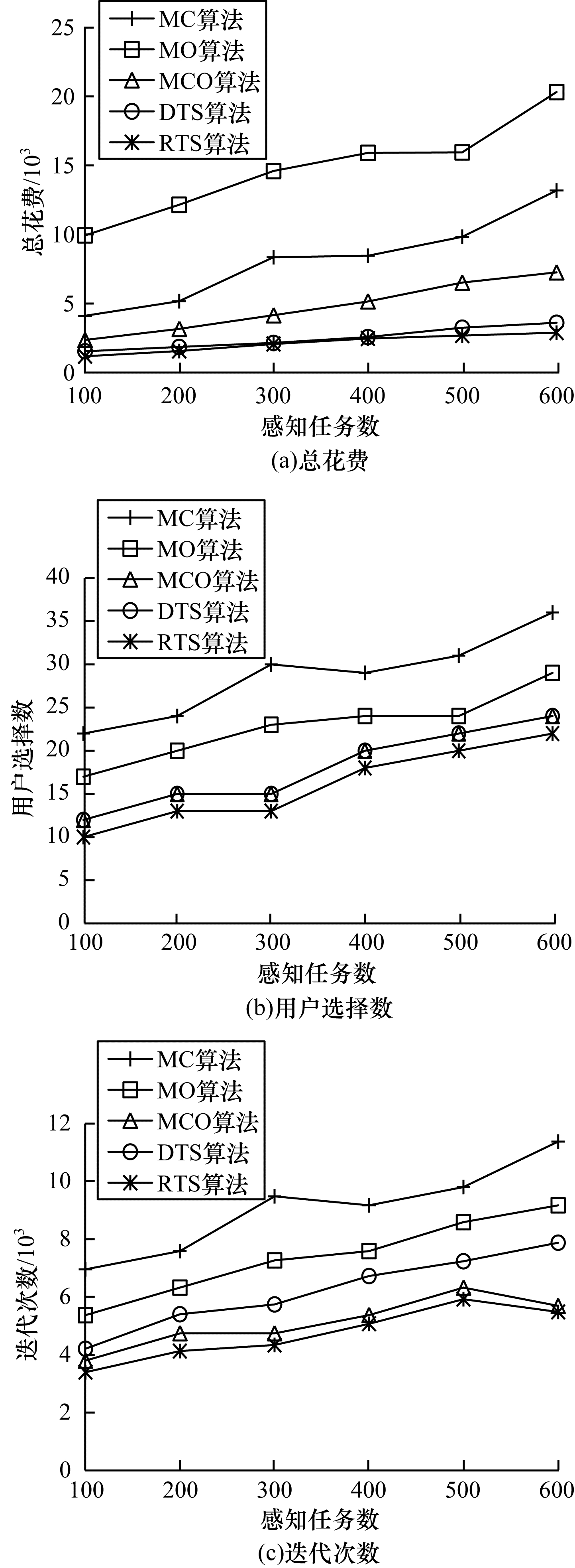 图 7表示用户数对总花费、用户选择数和迭代次数的影响。总体而言,随着用户数的增加,5种算法得到的总花费、用户选择数和迭代次数基本没有太大变化,大致呈现小幅度减少趋势,甚至有时出现总花费高、用户选择数多和迭代次数多的情况。其主要原因为平台发布的感知任务数已经固定,虽然用户数增加,但符合感知任务时空要求的用户数不一定再增大,反而会出现更多时空集合覆盖少、花费高的用户。因此,对于总花费和迭代次数而言,算法顺序依次为RTS < DTS < MCO < MO < MC;对于用户选择数而言,算法顺序依次为RTS < DTS=MCO < MO < MC。
