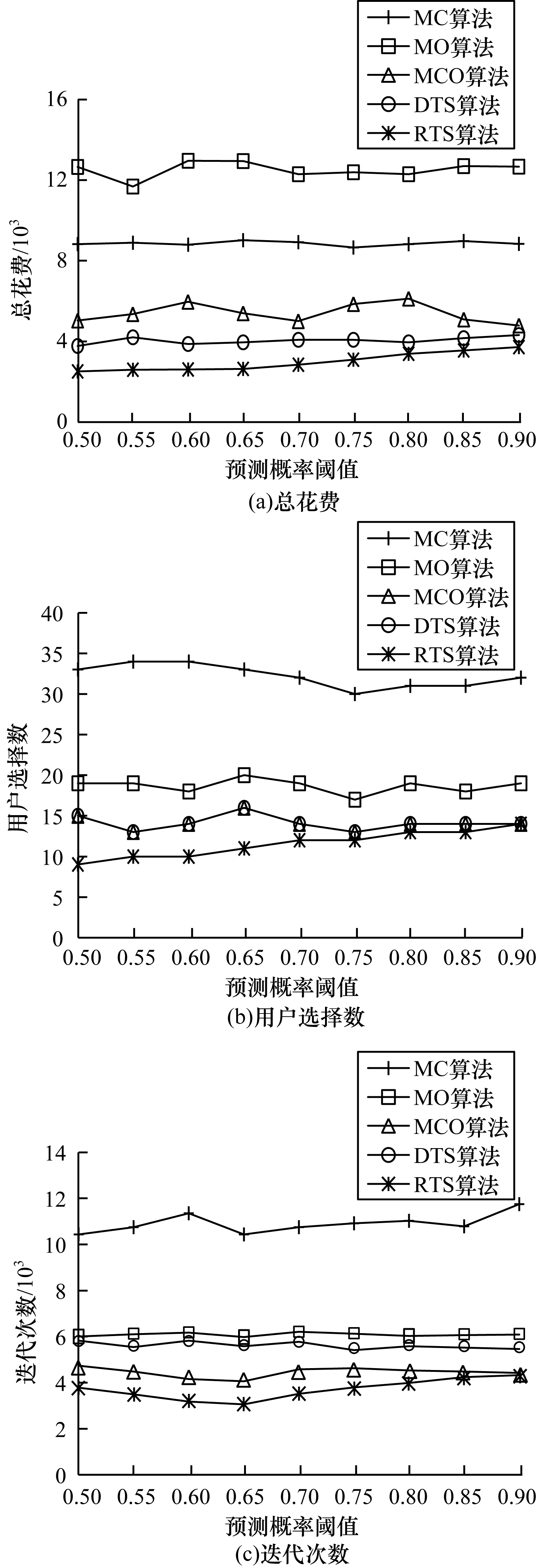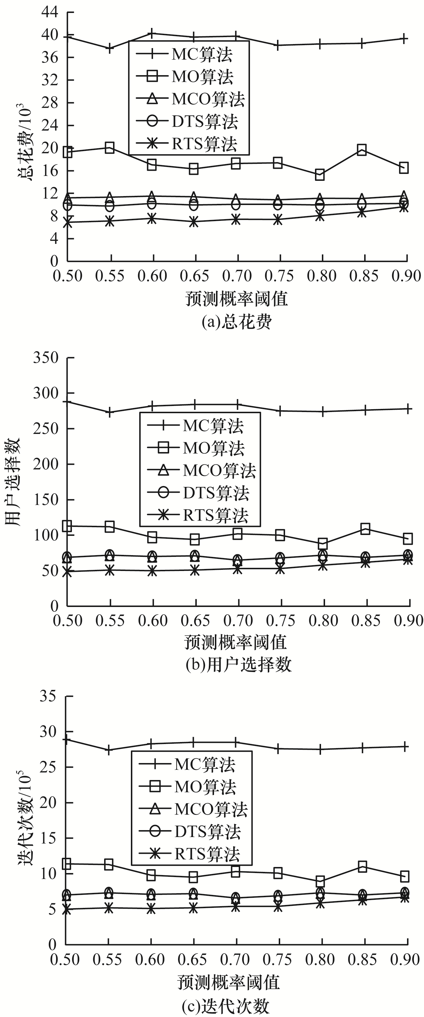 图 11表示预测概率阈值对总花费、用户选择数和迭代次数的影响。对比仿真数据实验的结果,除了总花费的影响外,其他没有太大变化,规律和逻辑都与仿真数据实验一致,随着预测概率阈值的增加,RTS越来越趋近DTS。因此,对于总花费而言,算法顺序依次为RTS < DTS < MCO < MC < MO;对于用户选择数而言,算法顺序依次为RTS < DTS=MCO < MO < MC;对于迭代次数而言,算法顺序依次为RTS < DTS < MCO < MO < MC。