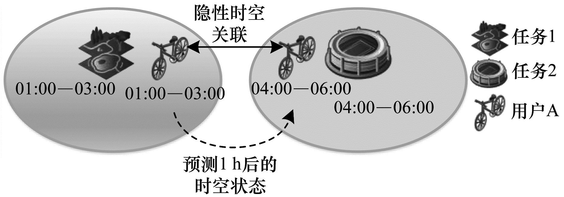 隐性时空关联状态如图 3所示。目前已知感知任务1和感知任务2,感知任务1的感知时间间隔为01:00—03:00、感知任务2的感知时间间隔为04:00—06:00;用户A在感知时间间隔01:00—03:00内停留在感知任务1的感知区域,通过预测1 h后的时空状态得到用户A在感知时间间隔04:00—06:00内停留在任务2的感知区域。