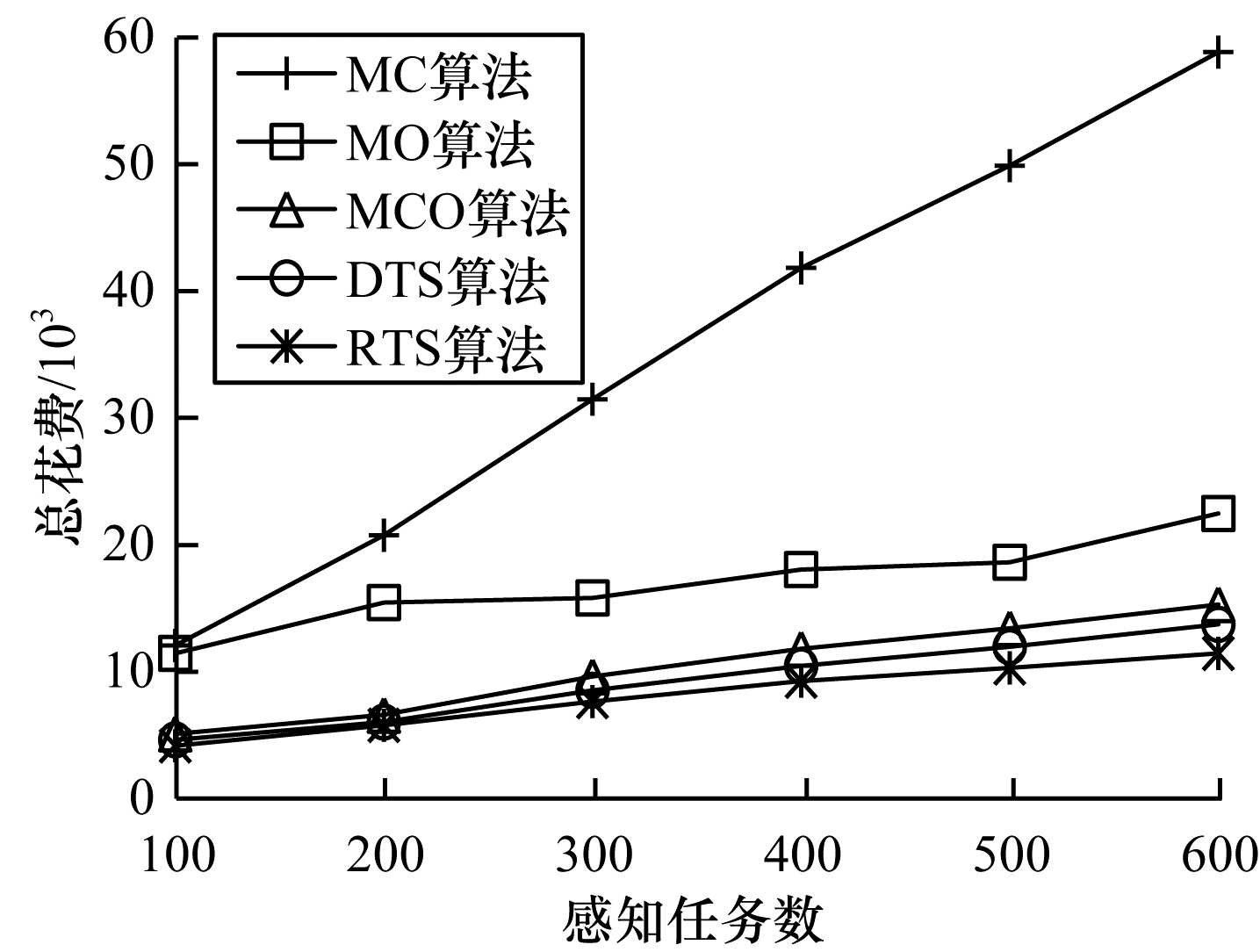 | 图 4 感知任务数对总花费的影响 Fig. 4 Impact of the number of sensing tasks on the total cost | |