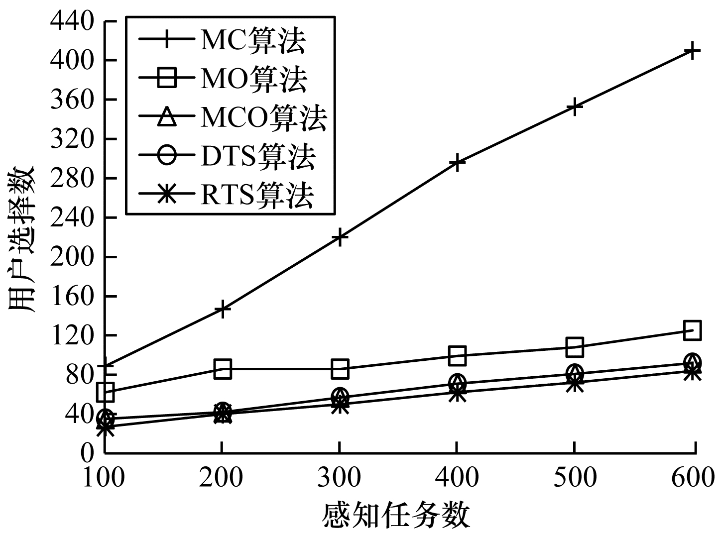 图 5表示感知任务数对用户选择数的影响。随着感知任务数的增加,5种算法的用户选择数随之增加,主要原因为平台需要招募更多的用户来完成更多的感知任务。对于用户选择数而言,算法顺序依次为RTS < DTS=MCO < MO < MC。基本规律及原因和总花费大致相同,但不同的是DTS和MCO,因为DTS在MCO执行完成后对已确定选择的用户进行重复时空集合的减少操作,但并不会减少用户数量,所以DTS=MCO。