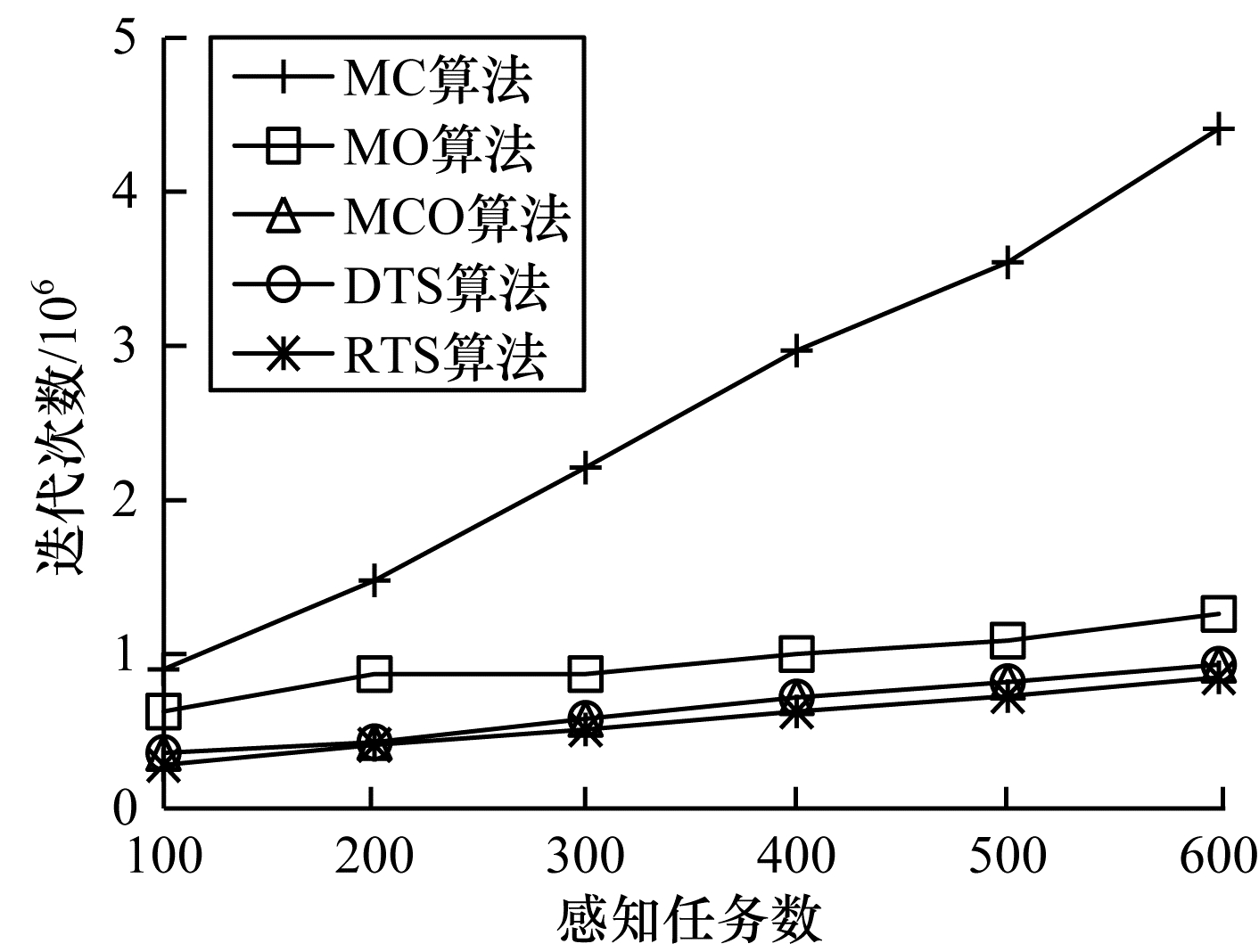 | 图 6 感知任务数对迭代次数的影响 Fig. 6 Impact of the number of sensing tasks on the number of iterations | |
