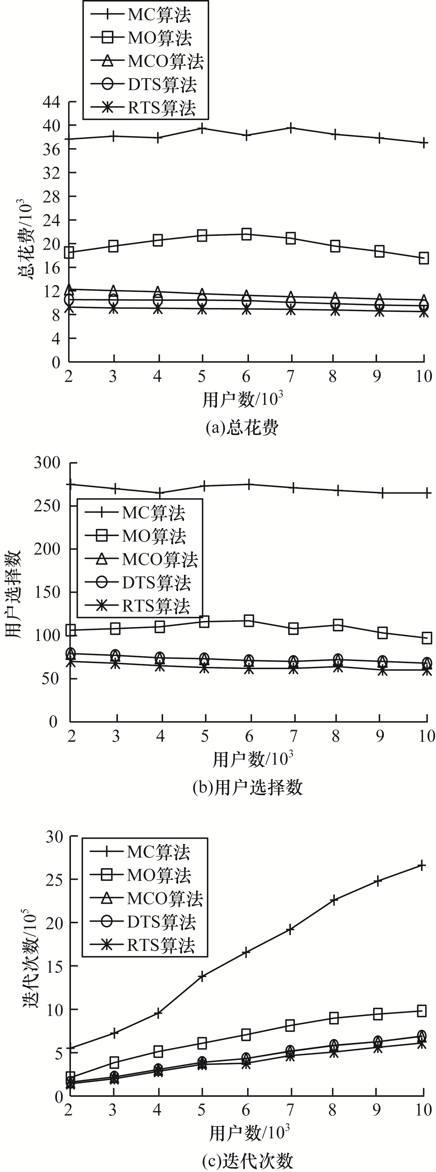 | 图 7 用户数对总花费、用户选择数和迭代次数的影响 Fig. 7 Impact of the number of users on the total cost, the number of user choices and the number of iterations | |