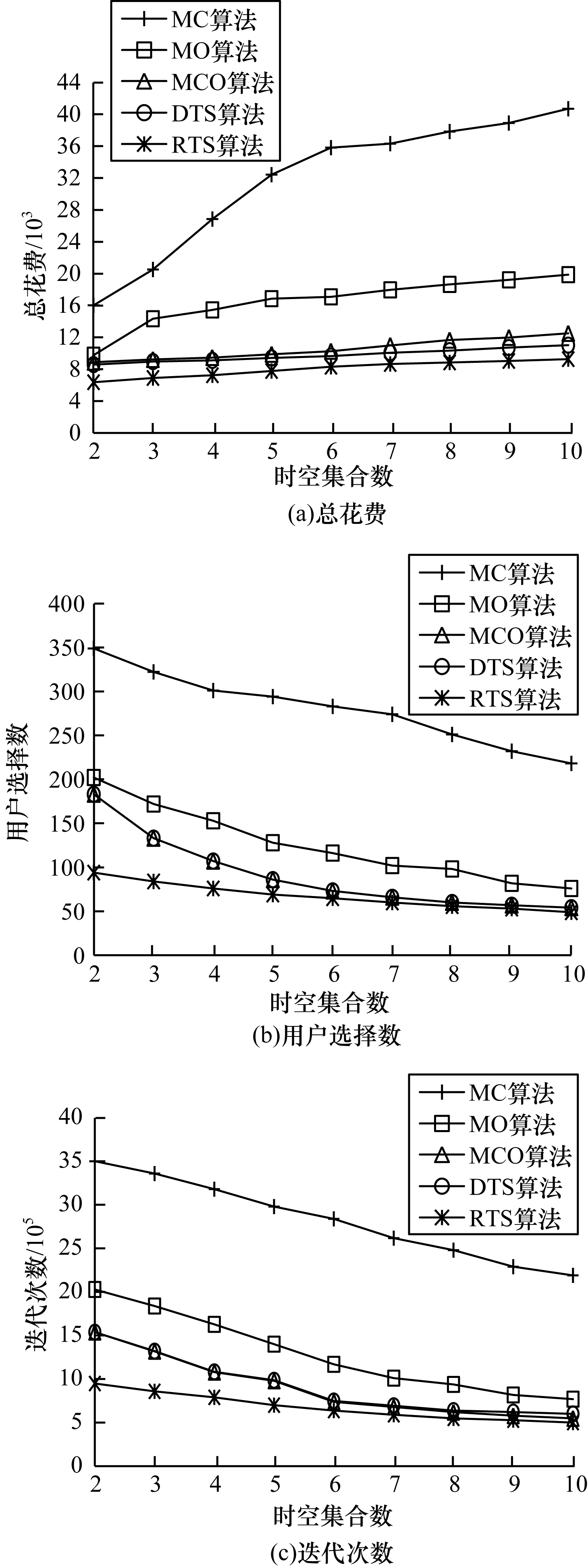 图 8表示用户时空集合数对于总花费、用户选择数和迭代次数的影响。随着单用户时空集合数增加,用户选择数以及迭代次数持续减少,但是总花费持续增加,对于MC而言,增大幅度最大,其主要原因为相对于单用户时空集合个数少的情况,MC每次选择的用户是花费较高的用户(时空集合多且花费高),而且这些用户的时空集合中只有少部分符合感知任务的时空要求,因此MC涨幅最大;DTS和RTS基本保持不变,用户的时空集合多,总花费高。因此,对于总花费和迭代次数而言,算法顺序依次为RTS < DTS < MCO < MO < MC,对于用户选择数而言,算法顺序依次为RTS < DTS=MCO < MO < MC。