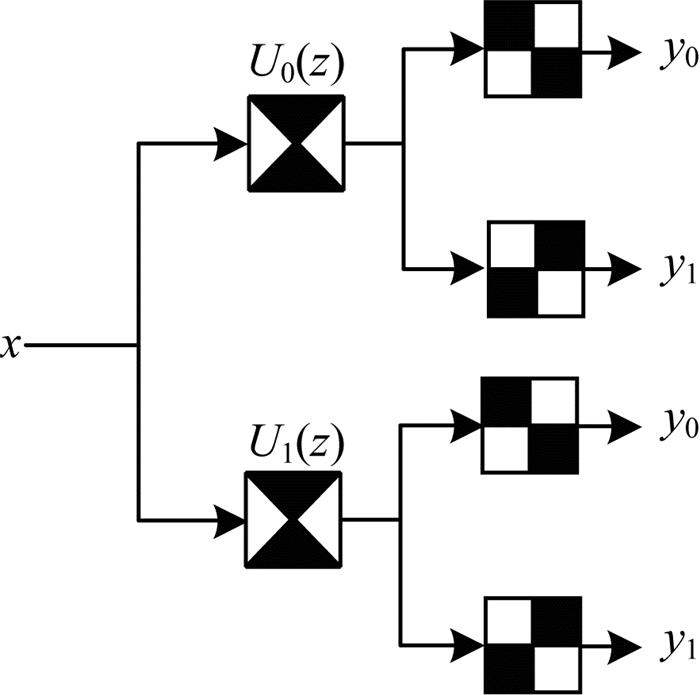 文献[19]提出一种方向滤波器组(Directional Filter Bank,DFB)。DFB将图像划分为具有方向性的子带,捕捉图像几何特征,但是其中的下采样操作使其缺乏平移不变性。非下采样方向滤波器组(Non-subsampled Directional Filter Bank,NDFB)[20]与DBF类似,可以对图像进行多方向分解,提取图像方向细节特征,但是其进行上采样操作,因而能够获得位移不变的方向扩展。NDFB是由扇形滤波器和棋盘滤波器构成的四方向滤波器组,基本结构如图 1所示。