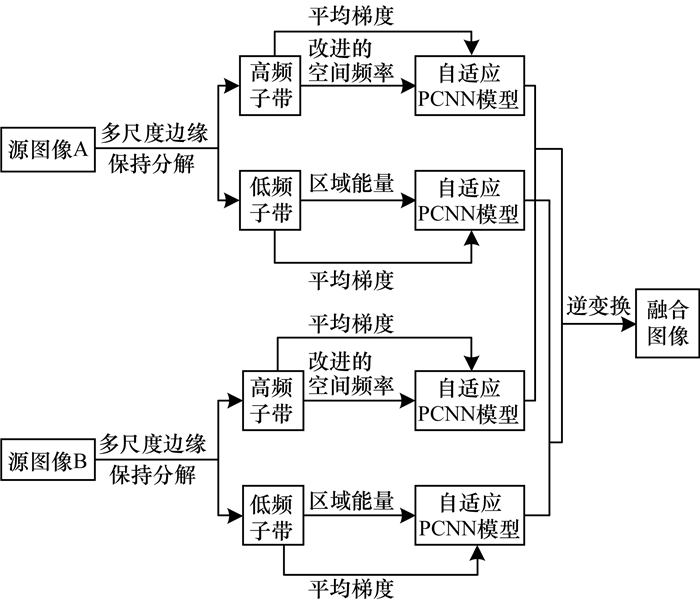 对已配准的源图像进行图像融合的主要步骤包括图像分解、图像融合和图像重构。本文在图像分解过程中引入多尺度边缘保持分解方法,对已配准的源图像进行分解得到低频层和高频层,而在图像融合过程中针对得到的低频层和高频层不同的特点,分别采用不同的融合规则进行融合,在图像重构中获得最终的融合的图像。融合过程如图 3所示。
