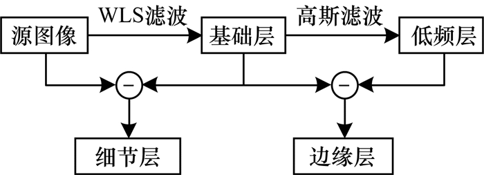 WLS滤波器可以有效地在模糊和锐化之间进行最佳折衷,更好地保留边缘,解决双边滤波在边缘处容易产生梯度反转的问题,弥补双边滤波无法很好地在多尺度上提取到细节信息的不足,从而更准确地提取多尺度信息。由于高斯滤波器只考虑像素的空间分布而没有考虑邻近像素的影响,因此具有对图像进行滤波时能够剔除细节信息、模糊边缘的特点。结合两种滤波的特性,本文对源图像进行多尺度分解。分解过程由以下步骤组成: