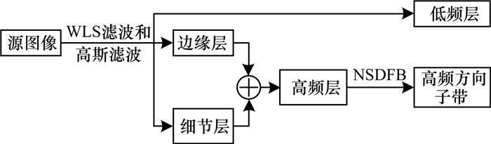 为解决该问题,研究人员将保边滤波器引入图像融合领域。保边滤波器具有平移不变性、空间一致性和边缘保护性能,而且计算效率较高。在此方面:文献[13]提出一种多尺度双边滤波器对源图像进行分解;文献[14]提出一种基于引导滤波的图像融合方案,其对源图像进行两尺度分解,通过引导滤波优化权重实现了空间一致性;文献[15]提出以多尺度极值滤波对源图像进行多尺度分解,采用对比度融合规则使融合图像更符合人眼视觉感知特性;文献[16]提出一种加权最小二乘滤波与引导滤波相结合的新方案,与只基于引导滤波的方法相比,该方案可以获得更好的效果。尽管上述方法在一定程度上保护了边缘信息,但是基础层主要包含粗尺度结构信息,直接对其融合可能在之后的融合过程中丢失或模糊保边滤波保留的显著的边缘特征[17]。