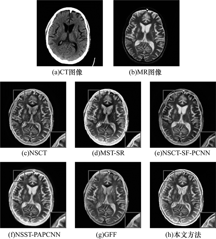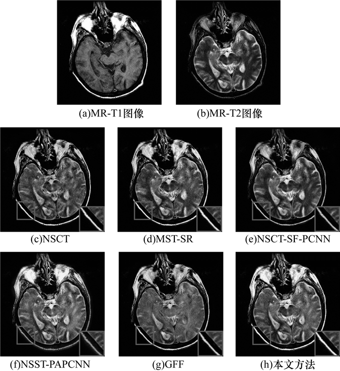 本文采用多发性脑梗塞MR-T1和MR-T2图像、脑弓形虫CT和MR图像、正常脑部脑CT和MR图像进行3组仿真实验,在64位Windows10操作系统、Matlab2014b平台上进行仿真。选取以下5种融合方法作为对比方法:1)基于NSCT的图像融合方法(NSCT);2)基于多尺度变换和稀疏表示的图像融合方法(MST-SR)[22];3)基于NSCT域下空间频率激励PCNN的图像融合方法(NSCT-SF-PCNN)[10];4)基于NSST与自适应PCNN的图像融合方法(NSST-PAPCNN)[11];5)基于引导滤波的图像融合方法(GFF)[14]。NSCT采用高频子带区域能量取大、低频子带加权平均的融合规则,MST-SR的多尺度分解方法选取为LP,分解等级为4。6种方法的实验结果如图 6~图 8所示。