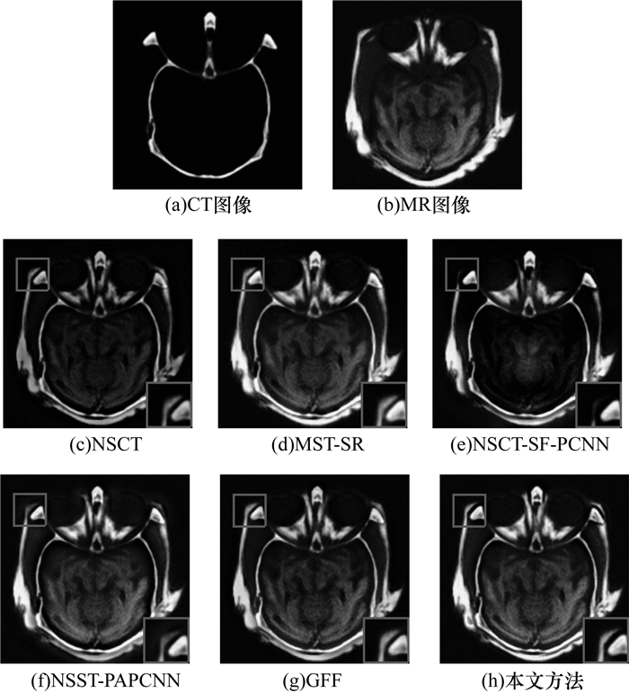 | 图 8 不同方法的正常脑部CT/MR图像融合结果 Fig. 8 Fusion results for CT/MR image of normal brain by different methods | |