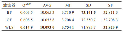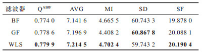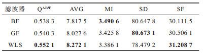3.2.2 不同滤波器的比较在本文方法中使用不同的保边滤波器进行实验,选取引导滤波器(Guided Filter,GF)和双边滤波器(Bilateral Filter,BF)与上文使用的WLS滤波器进行对比。双边滤波器参数设置为
