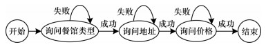 任务型多轮对话系统通过与用户进行多轮的对答,明确用户的需求,得到完成任务需要的信息,这个与用户进行多轮交互的过程类似于“初始状态→动作→更新状态→动作→更新状态→…→终止状态”的状态与触发动作进行交替的过程,与图模型中的有限状态自动机(Finite-State Machine,FSM)的定义非常吻合。有限状态自动机用来描述对象在一个生命周期内的状态序列以及状态间进行转移的动作事件,可以通过状态转移图来进行描述,图 1描述了在订餐任务中有限状态自动机的状态转移图示例。